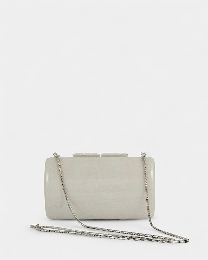 This ice-colored formal bag with silver crystal embellishments is the perfect choice for weddings, special events, and celebrations where elegance takes center stage. Its delicate and sophisticated icy hue is enhanced by a silver crystal appliqué that adds subtle sparkle and distinction. Compact yet functional, it allows you to carry your essentials in style.