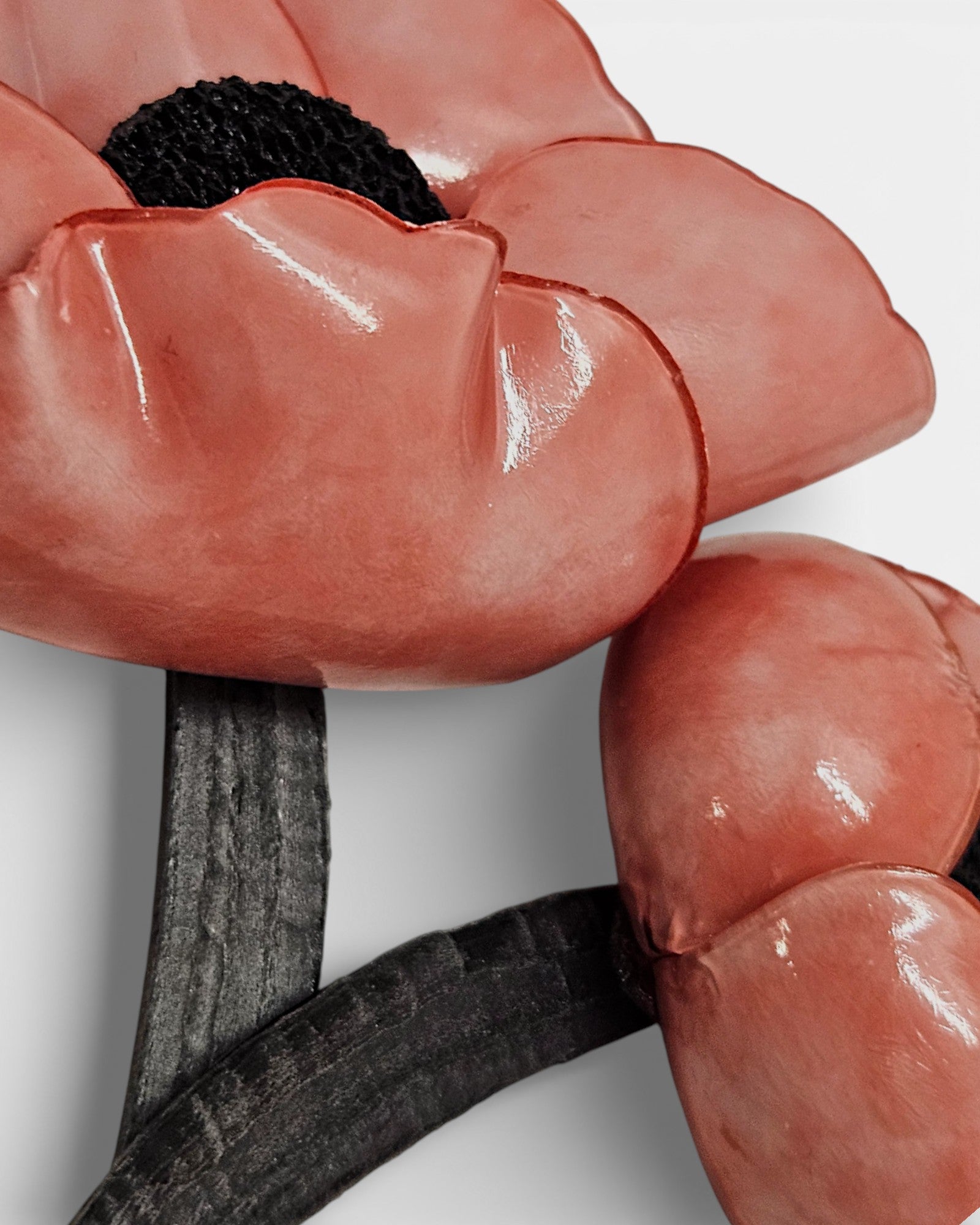 Color y Acabado: Pétalos en un suave tono rosa salmón con un acabado lacado brillante que captura la luz. Los centros y tallos presentan una textura mate en color negro carbón para un contraste moderno y audaz.