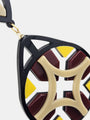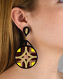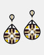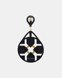Pendant made of overlapping resins with a geometric design combining the colors black, maroon and yellow.