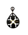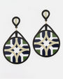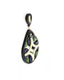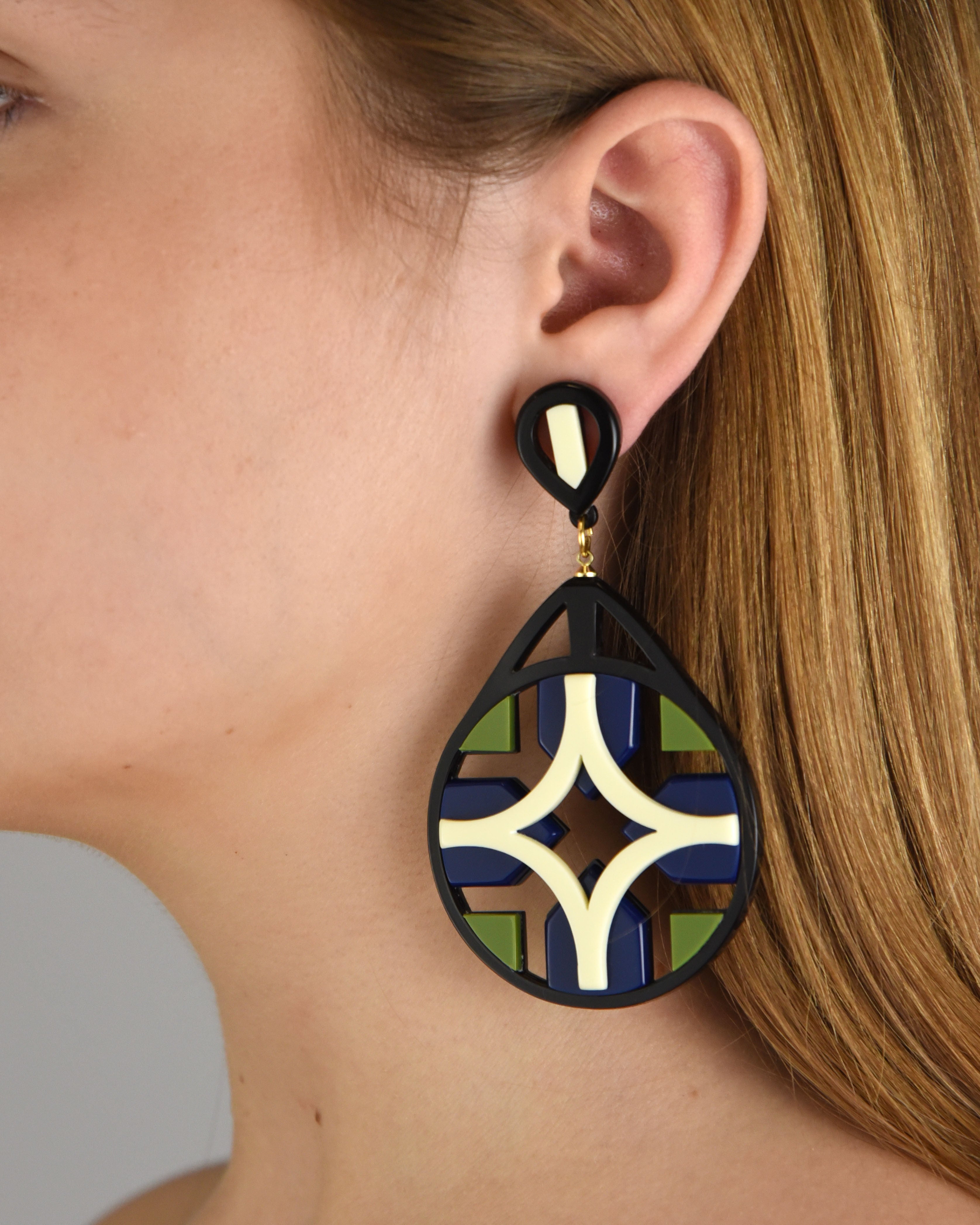 Pendant made of overlapping resins with a geometric design combining the colors white, blue, green and black