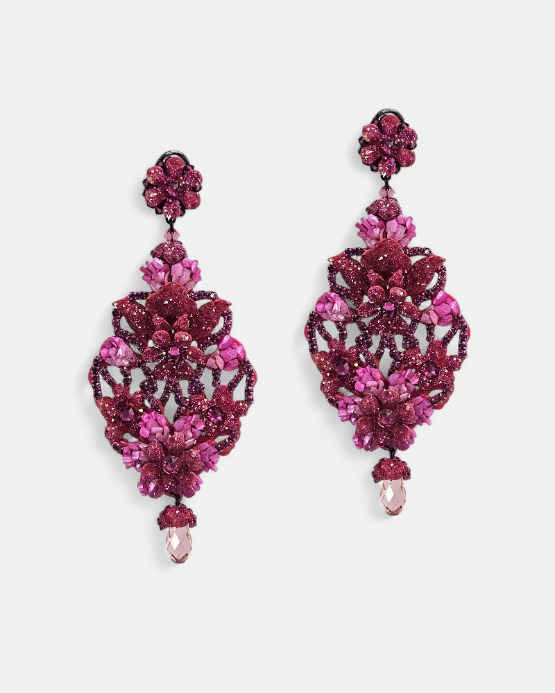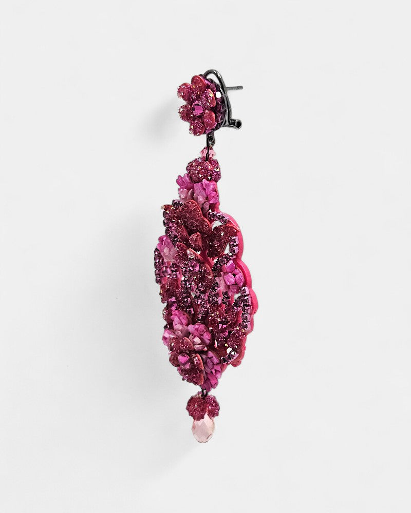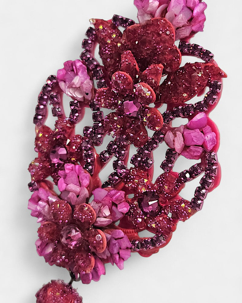 El diseño combina elementos en tono rosa y fucsia intenso, utilizando micro-pedrería brillante que simula el rocío sobre los pétalos, junto a inserciones de nácar o piedra natural tallada en formas orgánicas. El calado de la base permite que la pieza mantenga una ligereza visual a pesar de su gran tamaño. Como broche final, una lágrima de cristal facetado en rosa empolvado cuelga de la base, aportando un movimiento elegante y un punto de luz extra.