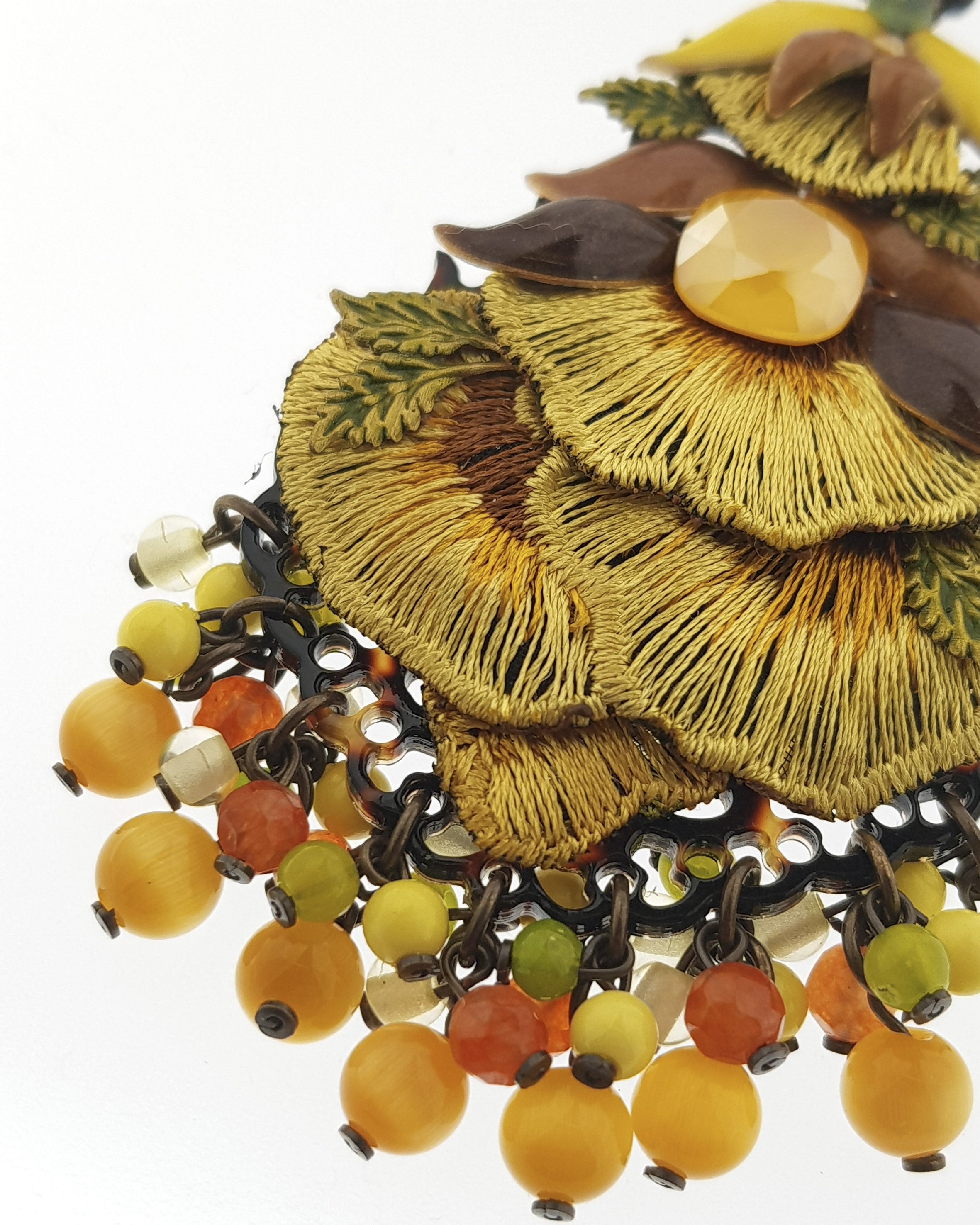 Made from fabrics embroidered with enamel pieces and beads in ochre, green, and tan tones