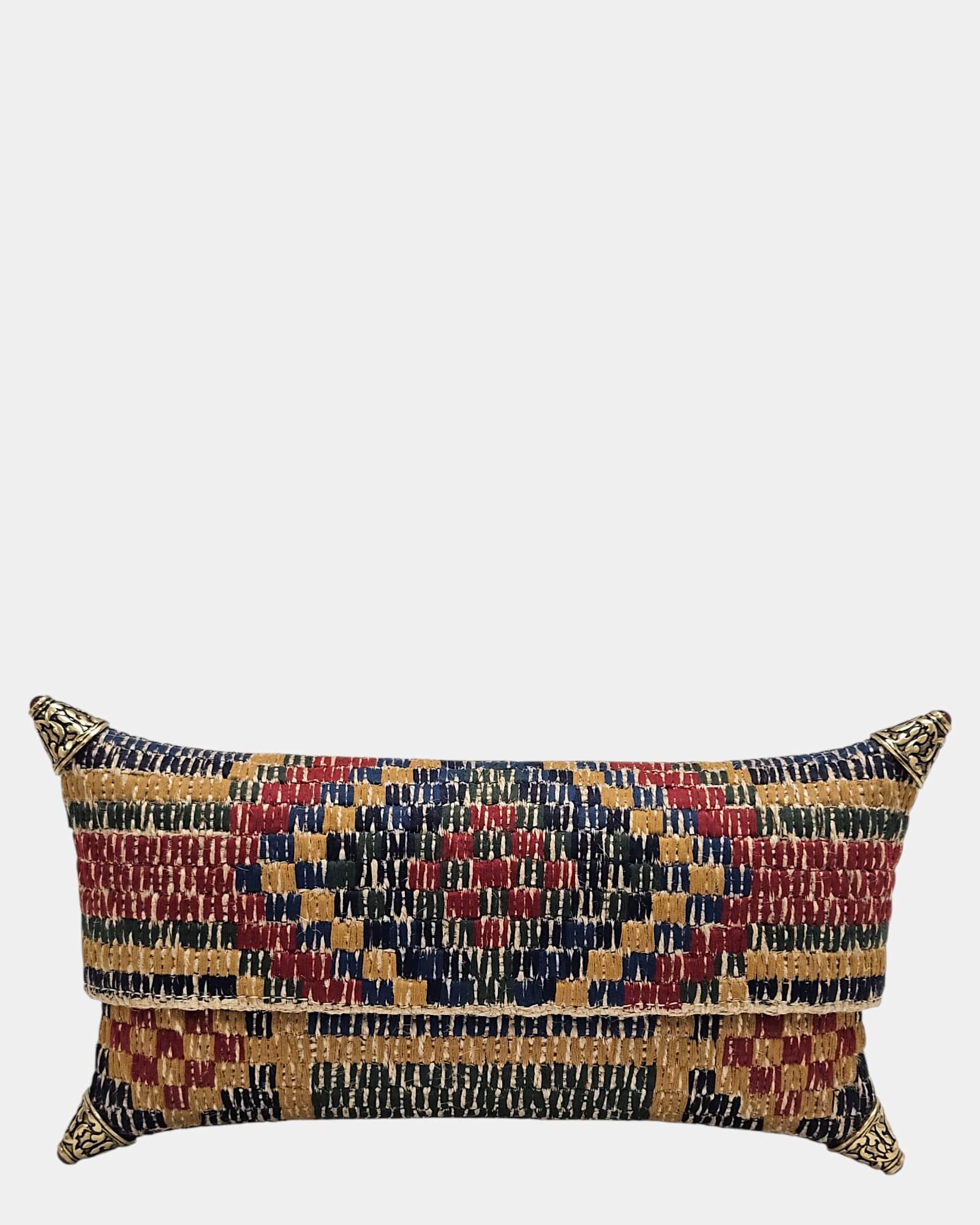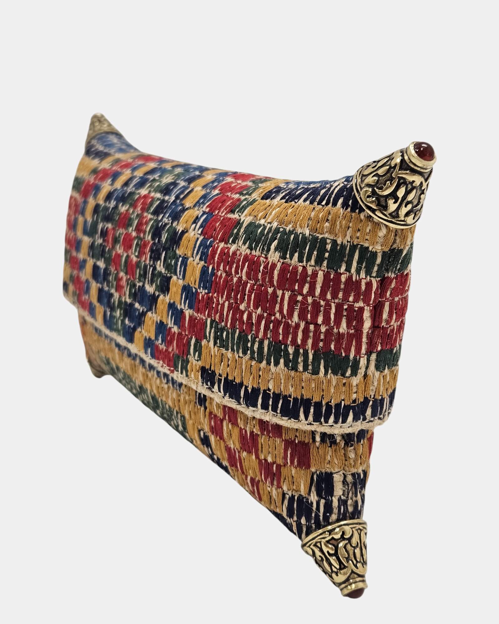El caleidoscopio de alta costura que elevará tu armario al instante. Un clutch arquitectónico en vibrante yute multicolor que fusiona la alegría del color estival con la autoridad geométrica del latón y el magnetismo del ágata roja.