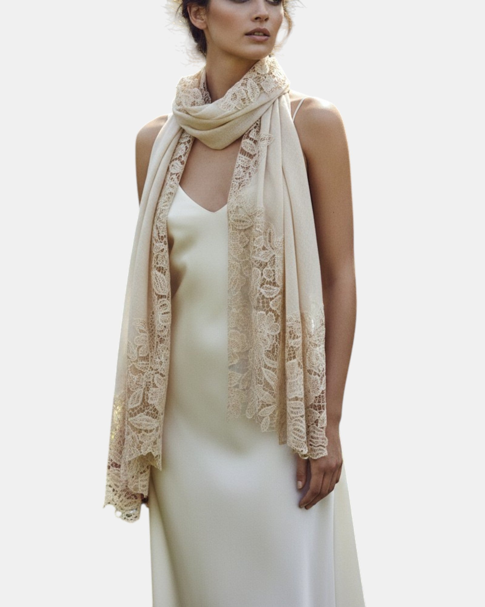 El Modelo Sabella no es solo un fular; es una pieza de coleccionista diseñada para momentos inolvidables. Con un aire etéreo y una delicadeza sublime, este accesorio combina el blanco más puro con intrincados bordados en hilo de oro, creando una armonía visual que evoca la artesanía clásica bajo un prisma de lujo contemporáneo.