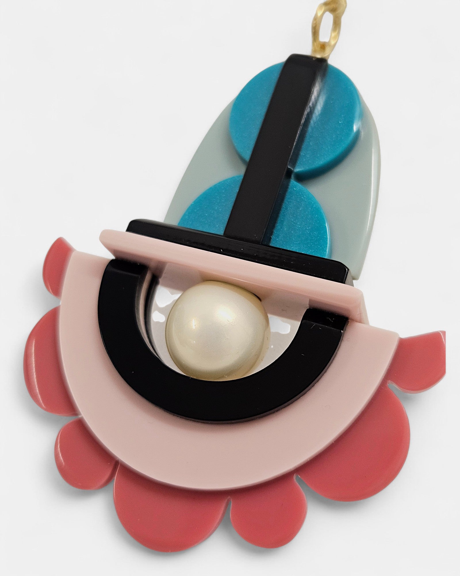 Au centre de la partie inférieure se trouve une perle acrylique qui apporte une touche de sophistication au bijou. Le contraste entre les lignes droites et courbes crée une pièce d'inspiration artistique, idéale pour celles et ceux qui recherchent un accessoire original et contemporain.
