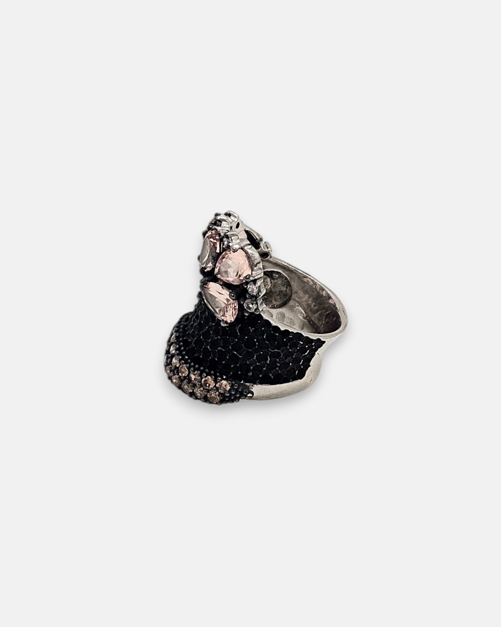 Cromaticidad Cálida: El contraste entre la plata oscura y las piedras en tonos champagne y café crea una armonía elegante y atemporal.