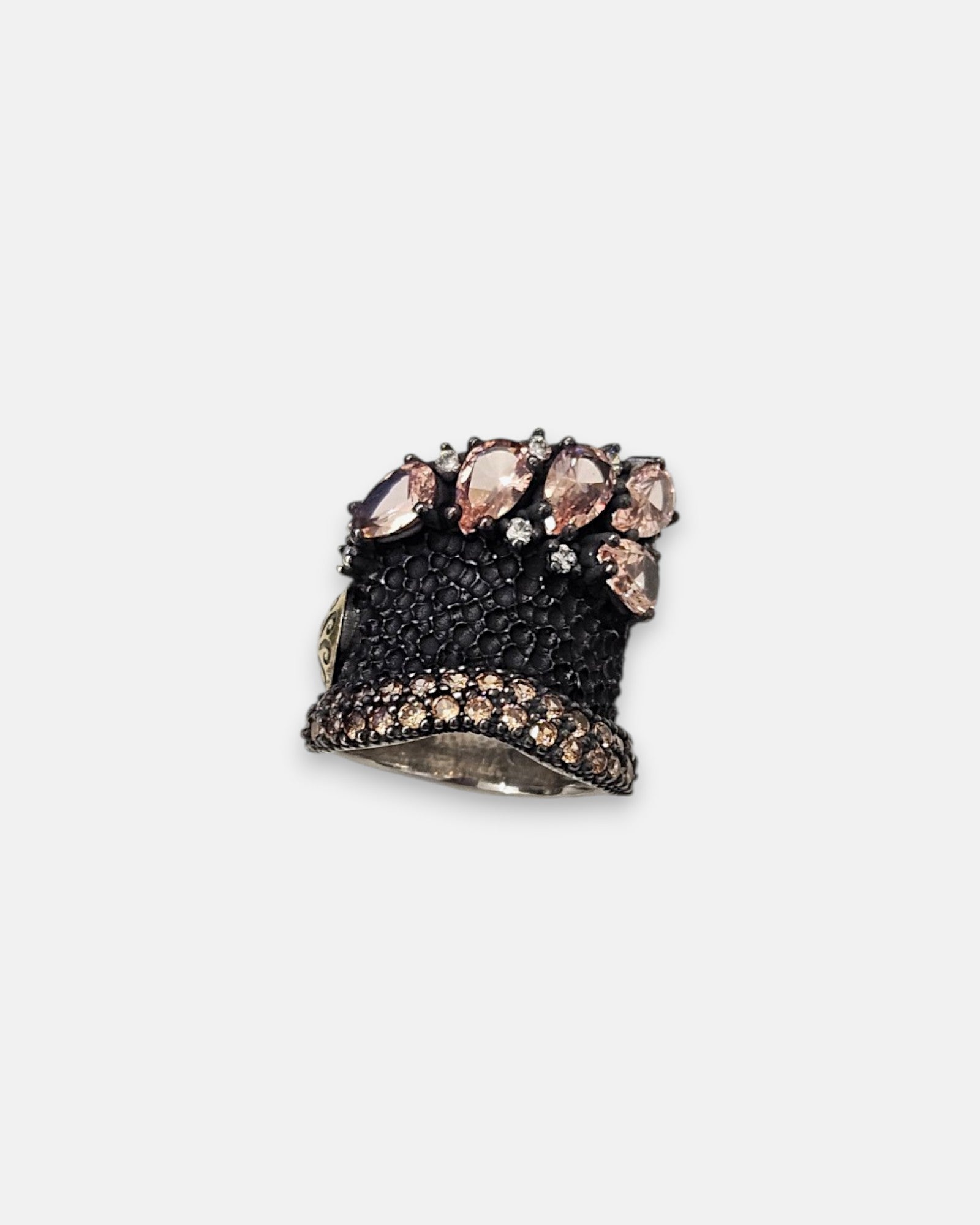 La pieza central está coronada por una espectacular hilera de piedras en talla pera de color champagne, que aportan una calidez radiante y un aire vintage de lujo. En la base, una doble fila de pavé en tonos bronce y marrón completa esta arquitectura joyera. Fiel al ADN de Bohemme, incluye un detalle lateral en Oro de 18K que certifica su exclusividad.