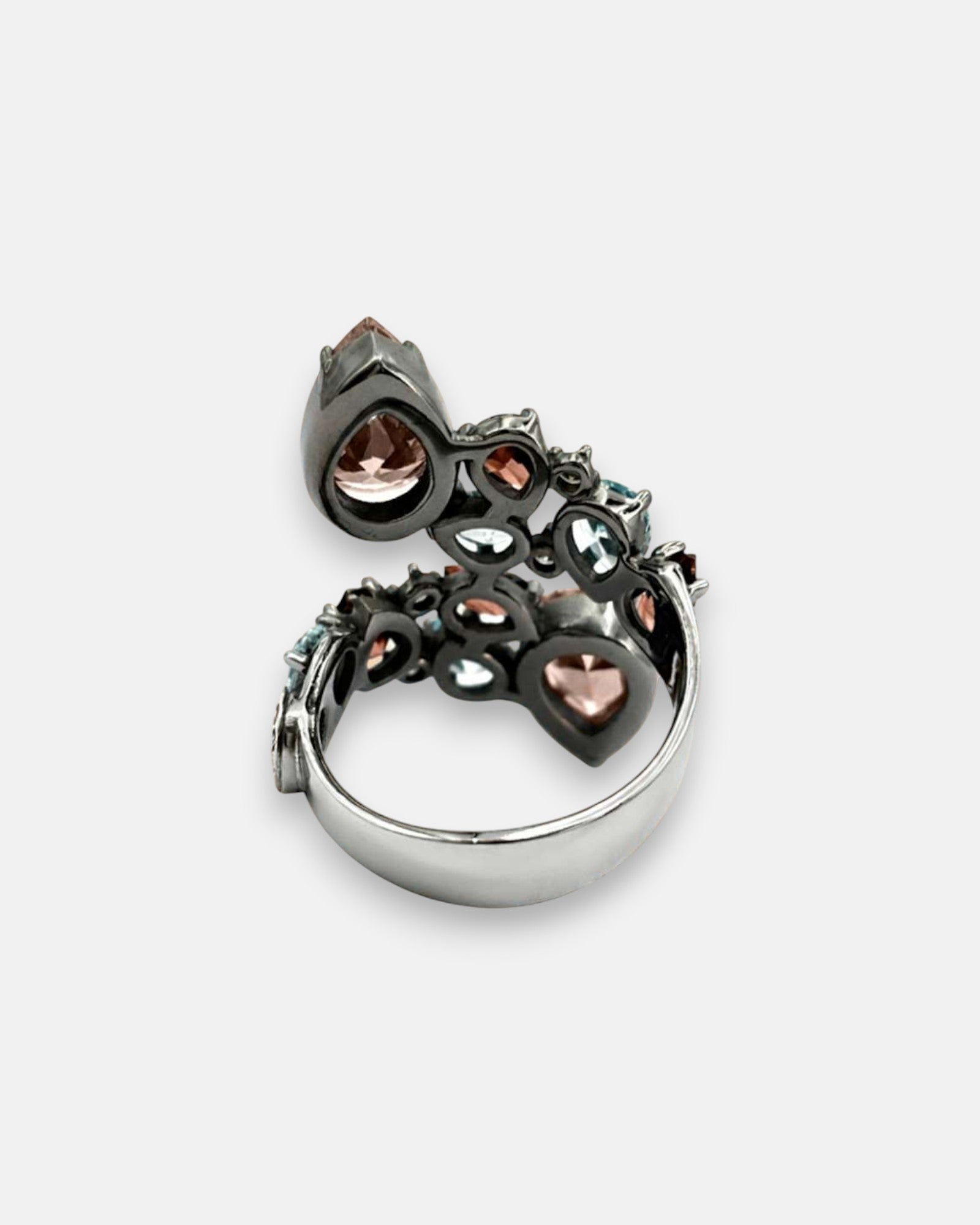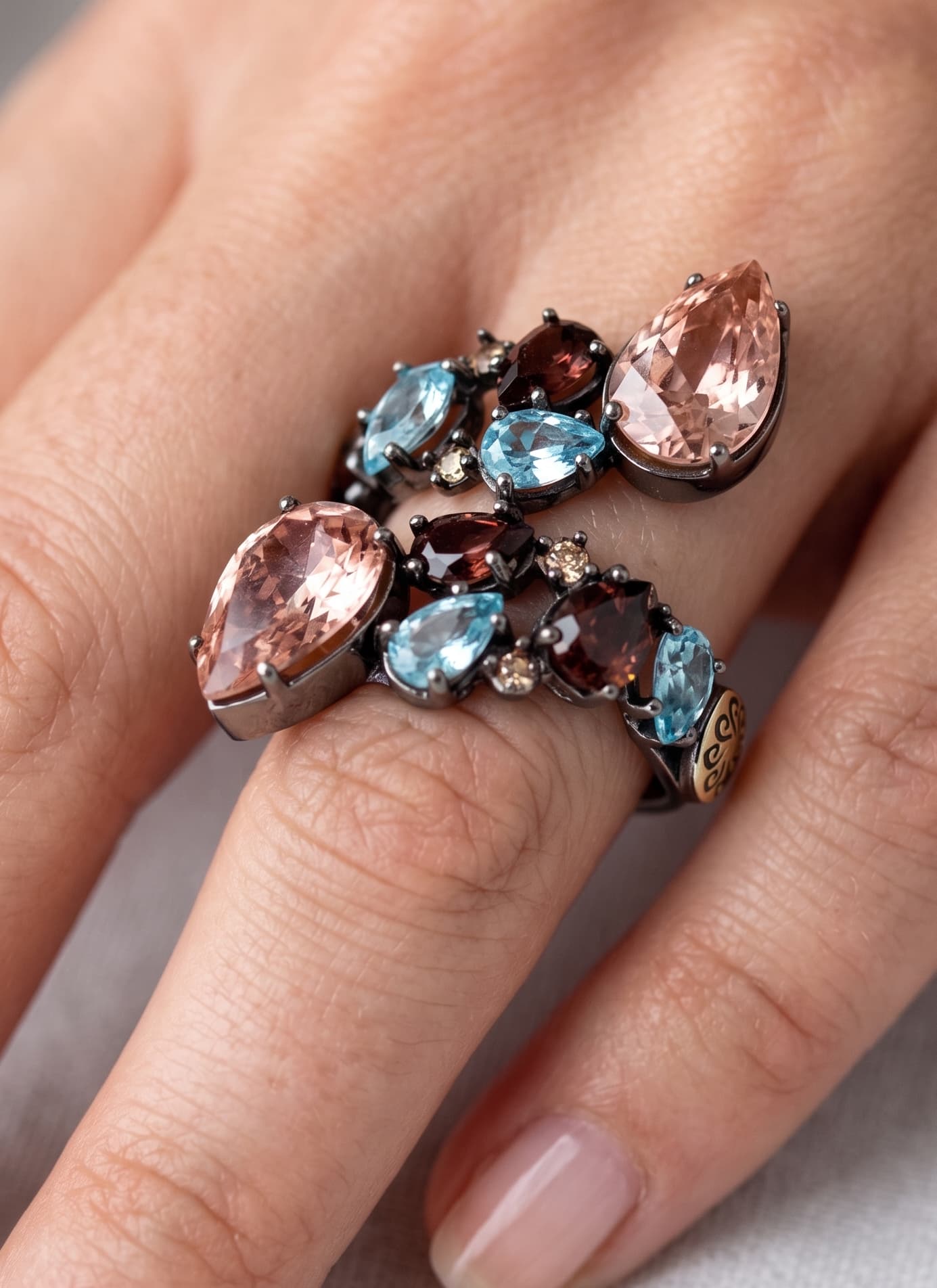 Fabricado en Plata de Ley 925 con acabado oxidado, la montura oscura actúa como un lienzo de alto contraste para un vibrante mosaico de piedras. Presenta una armoniosa combinación de circonitas en talla pera en tonos rosa empolvado y azul aguamarina, salpicadas con destellos de circonitas brown en talla circular. Como sello de exclusividad, el extremo de la banda incorpora el medallón lateral en Oro de 18K, símbolo de la nobleza y autenticidad de la marca.