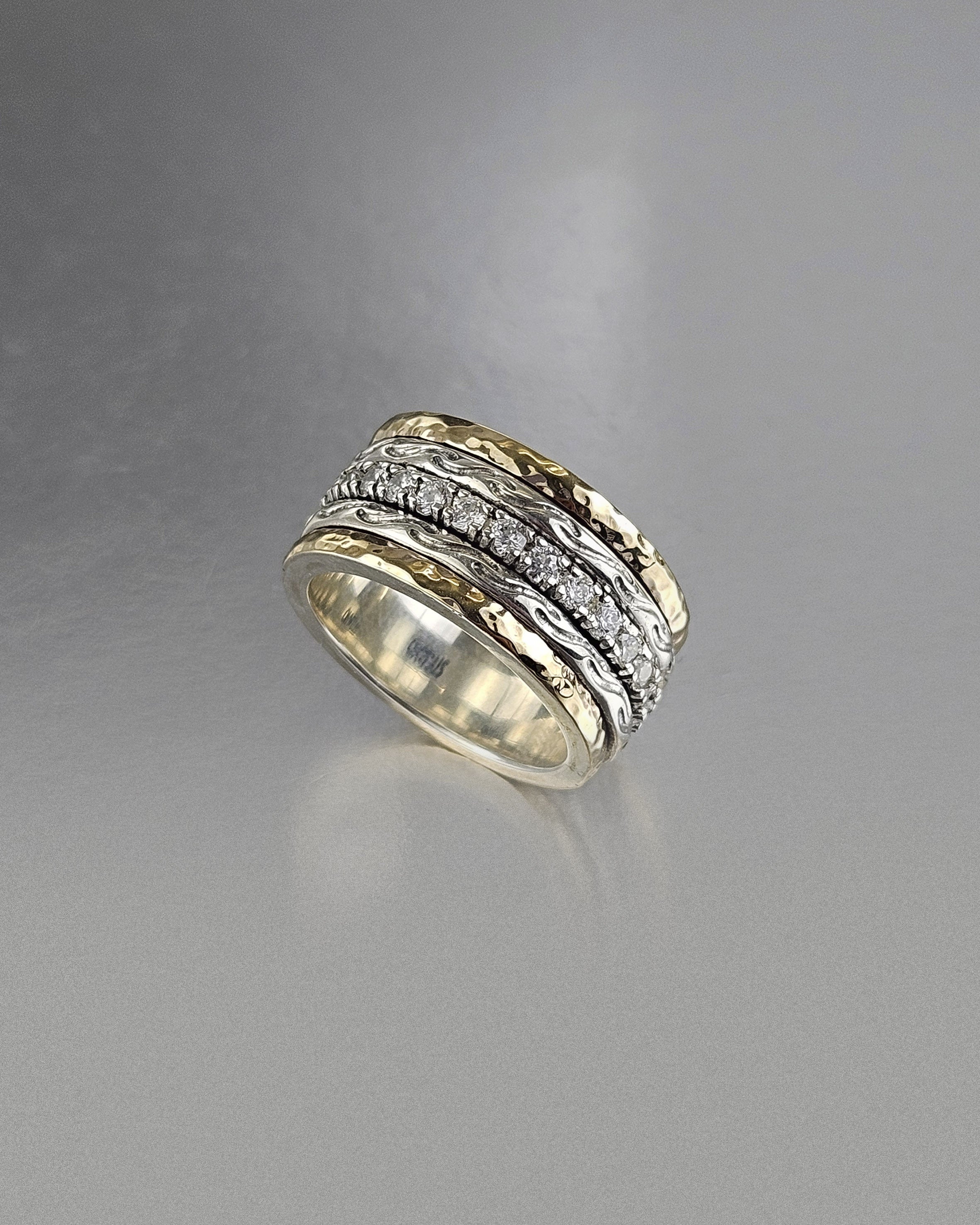 Diseño en plata labrada con diferentes aros giratorios en circonita, plata y oro