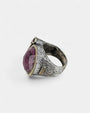 Su diseño escultórico y orgánico resalta un rubí natural facetado como piedra central, acompañado por turmalinas de distintos tonos que aportan luz y contraste.
