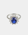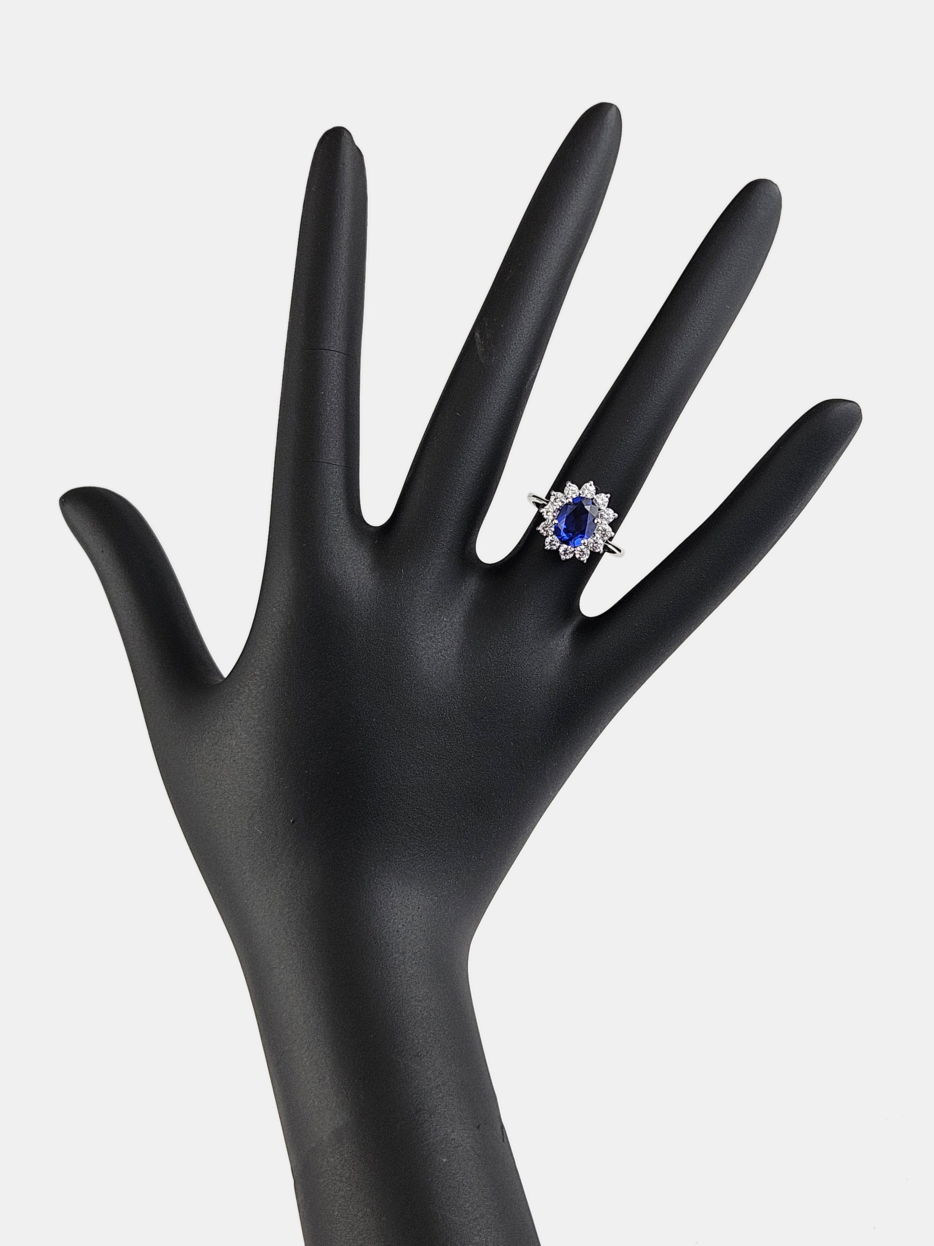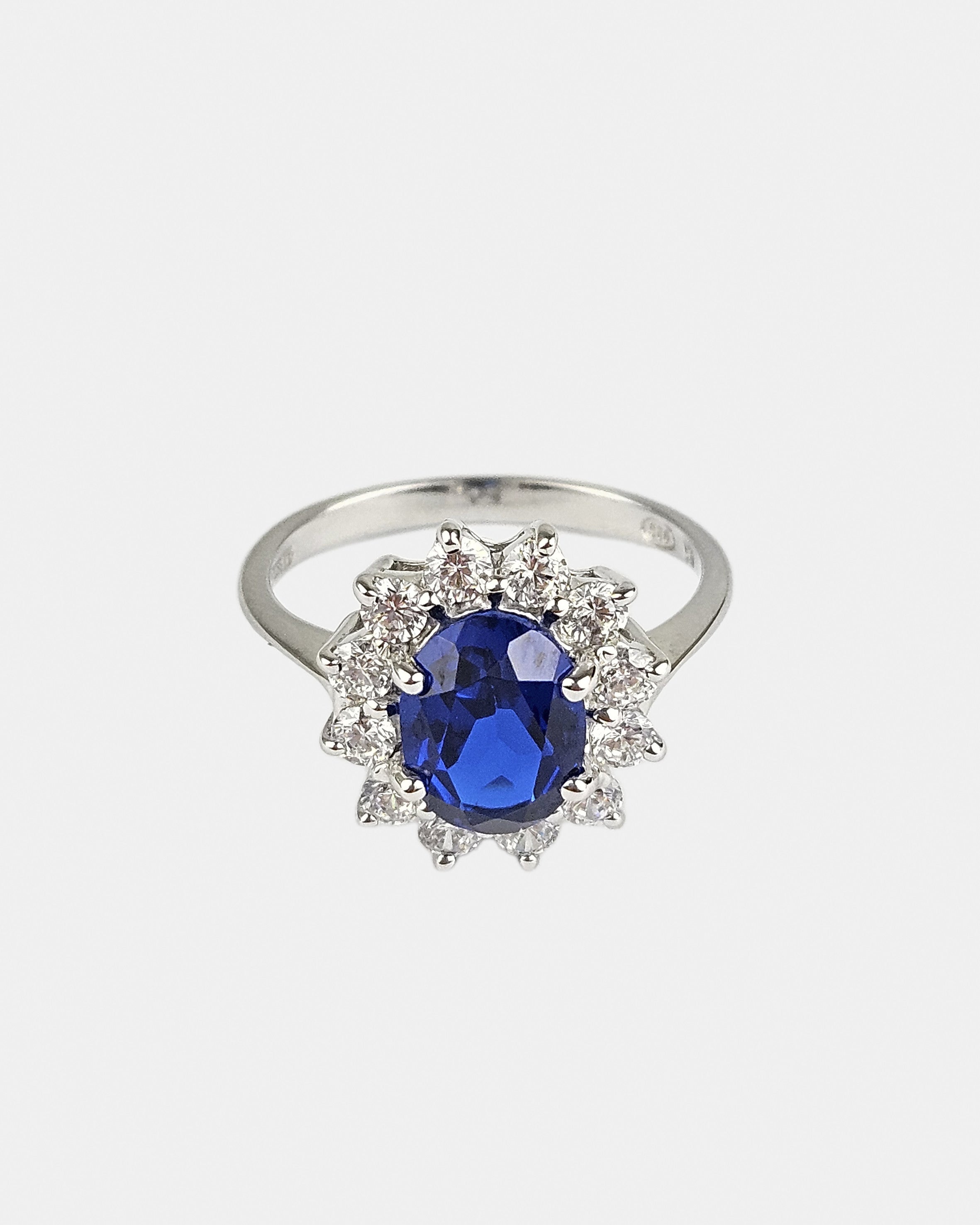 Sortija de plata con pieza central en talla oval color azul topacio y orla de circonitas blancas