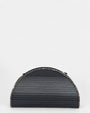 Sofisticado, original y con luz propia. Este bolso de ceremonia en tono gris plomo con detalle de cristal plata y diseño tipo persiana plisada y de media luna es una joya discreta que no pasa desapercibida.