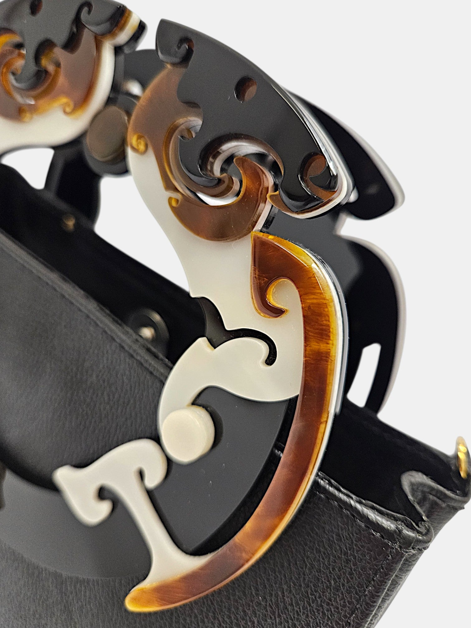 Descubre la elegancia única del bolso Gissa Bicalho negro, una pieza artesanal creada en Brasil que combina sofisticación y diseño contemporáneo. Su asa escultórica en acrílico aporta un aire artístico inspirado en el estilo art déco, convirtiéndolo en mucho más que un accesorio: es una obra de diseño.