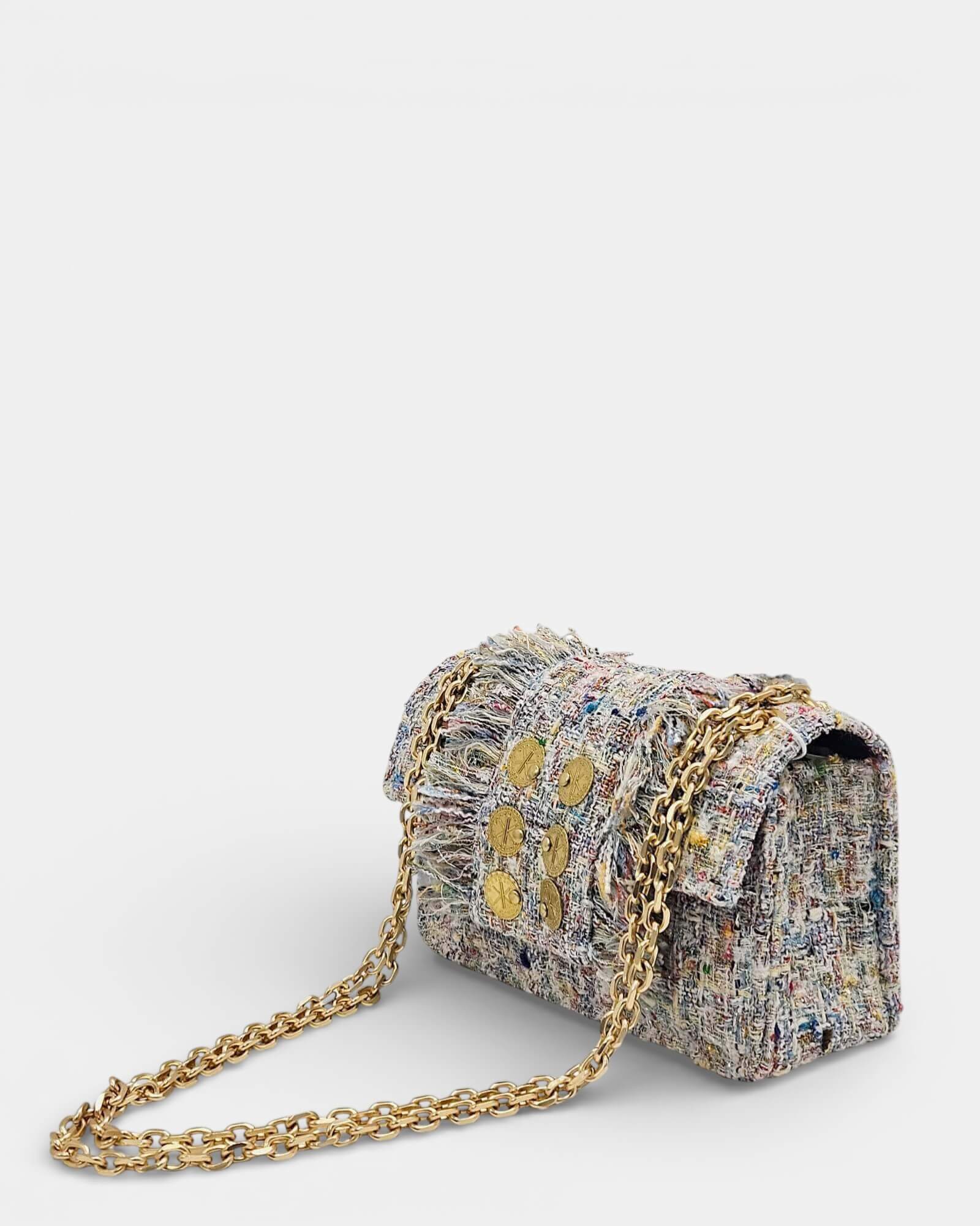 Seleccionado para nuestra colección de temporada, el modelo New Yorker Micro personifica el lujo táctil en su formato más exquisito y compacto. Elaborado a mano en Atenas, esta pieza actúa como una joya visual gracias a su tejido de tweed en una sinfonía de azules —desde el índigo profundo hasta el celeste etéreo— que crean una textura rica y vibrante. Su silueta micro es una declaración de estilo: pequeña, arquitectónica y rematada con su icónica cadena de bronce, diseñada para portar solo lo esencial con máxima elegancia. Cada ejemplar es único: el forro interior, con motivos inspirados en la tradición griega, asegura que su pieza sea una obra de arte íntima y únicamente suya.