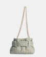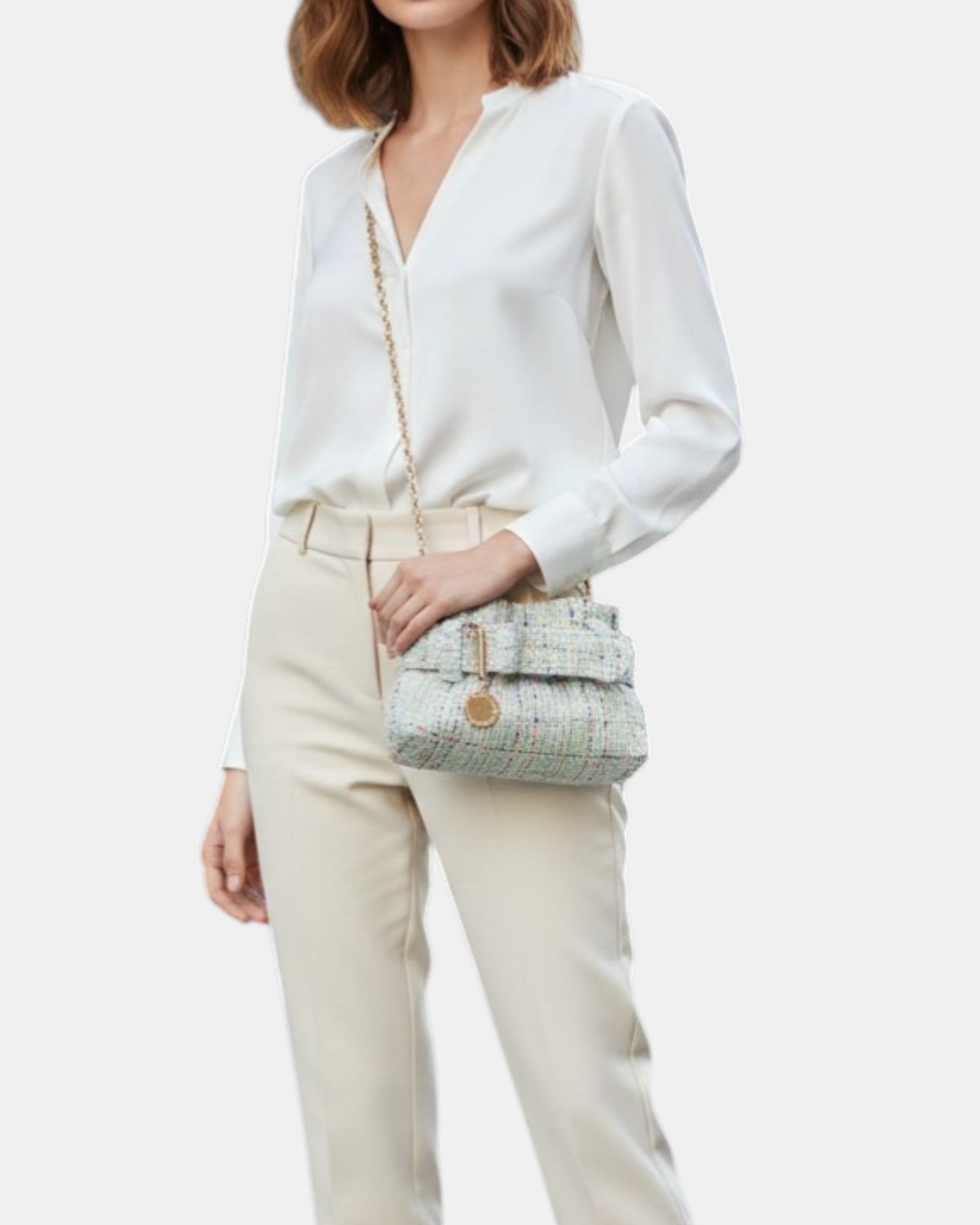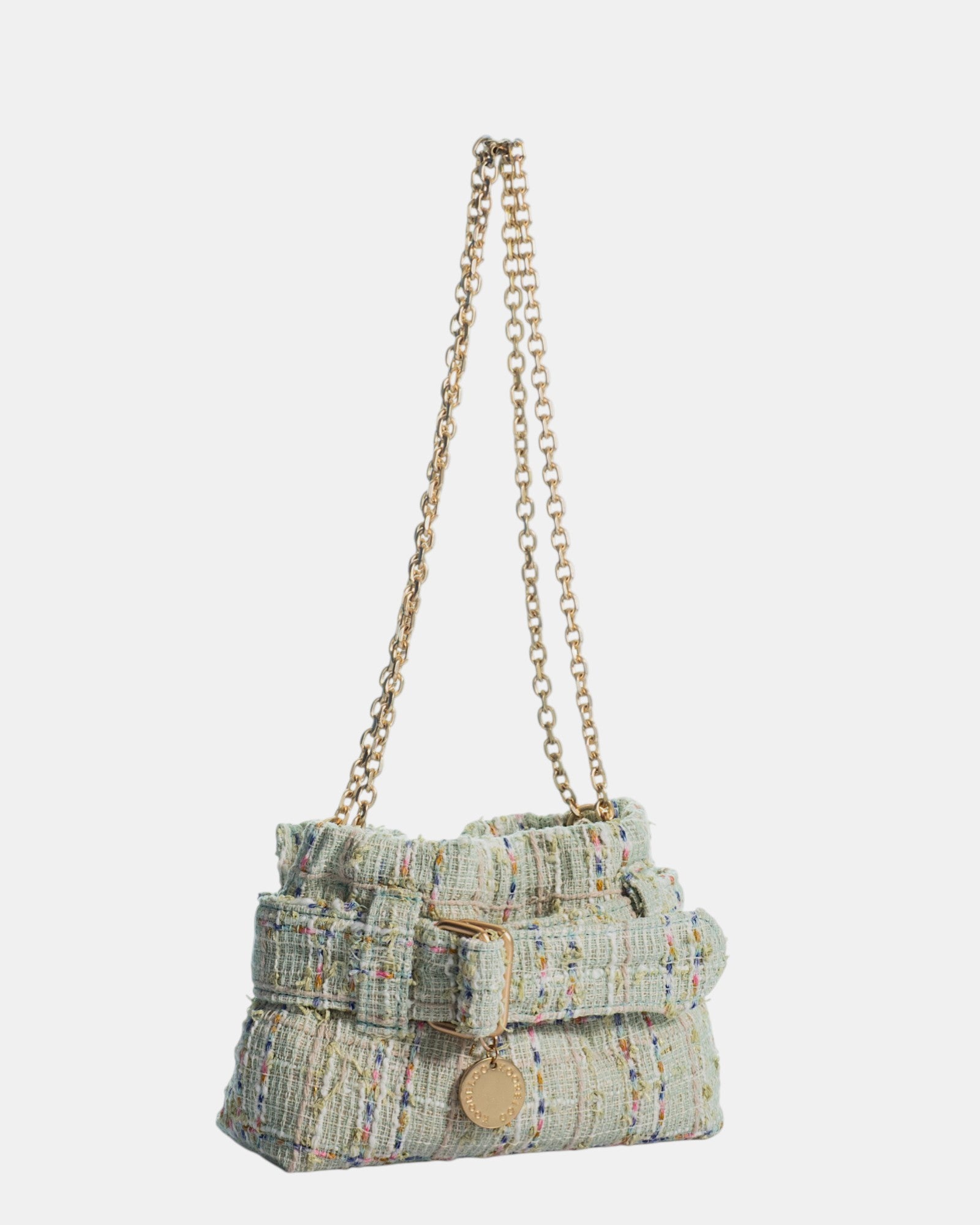 Confeccionado en un exquisito tweed color pistacho con sutiles hilos multicolores, este modelo destaca por su silueta tipo "bucket" estructurada y su acabado ligeramente deshilachado que le otorga un aire "boho-chic" inigualable.