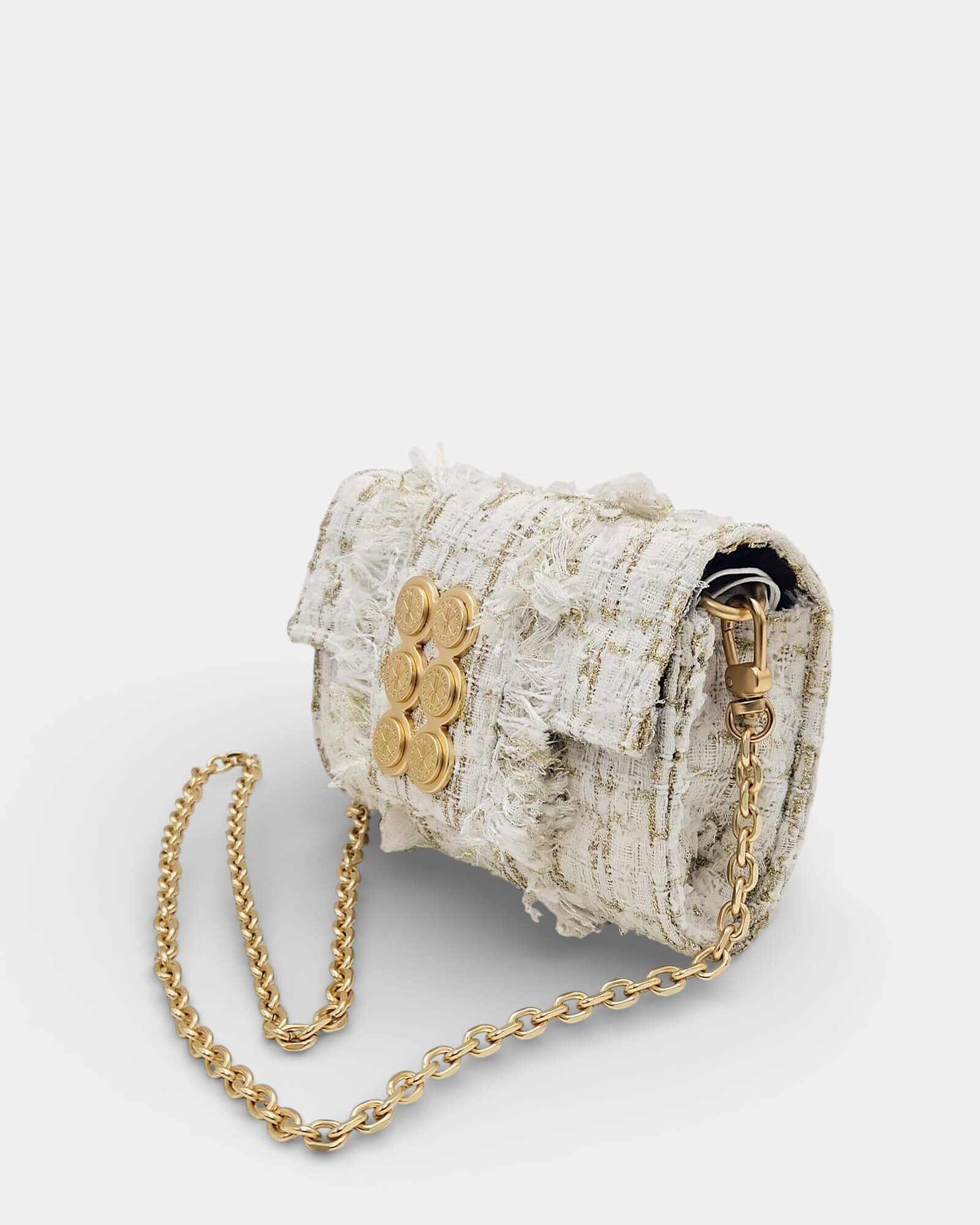 Seleccionado para nuestra colección más exquisita, el modelo Amalfi 3.0 personifica el lujo táctil en su versión más sofisticada y luminosa. Elaborado a mano en Atenas, esta pieza hipnotiza por su tejido de tweed donde el blanco inmaculado se entrelaza con hilos de oro, creando un efecto "polvo de estrellas" que captura la luz con cada movimiento. Su silueta es suave pero estructurada, evocando la arquitectura de la costa italiana que le da nombre. Es una joya visual que trasciende la funcionalidad. Cada ejemplar es único: el forro interior, con motivos inspirados en la tradición griega, asegura que su pieza sea una obra de arte íntima y únicamente suya.