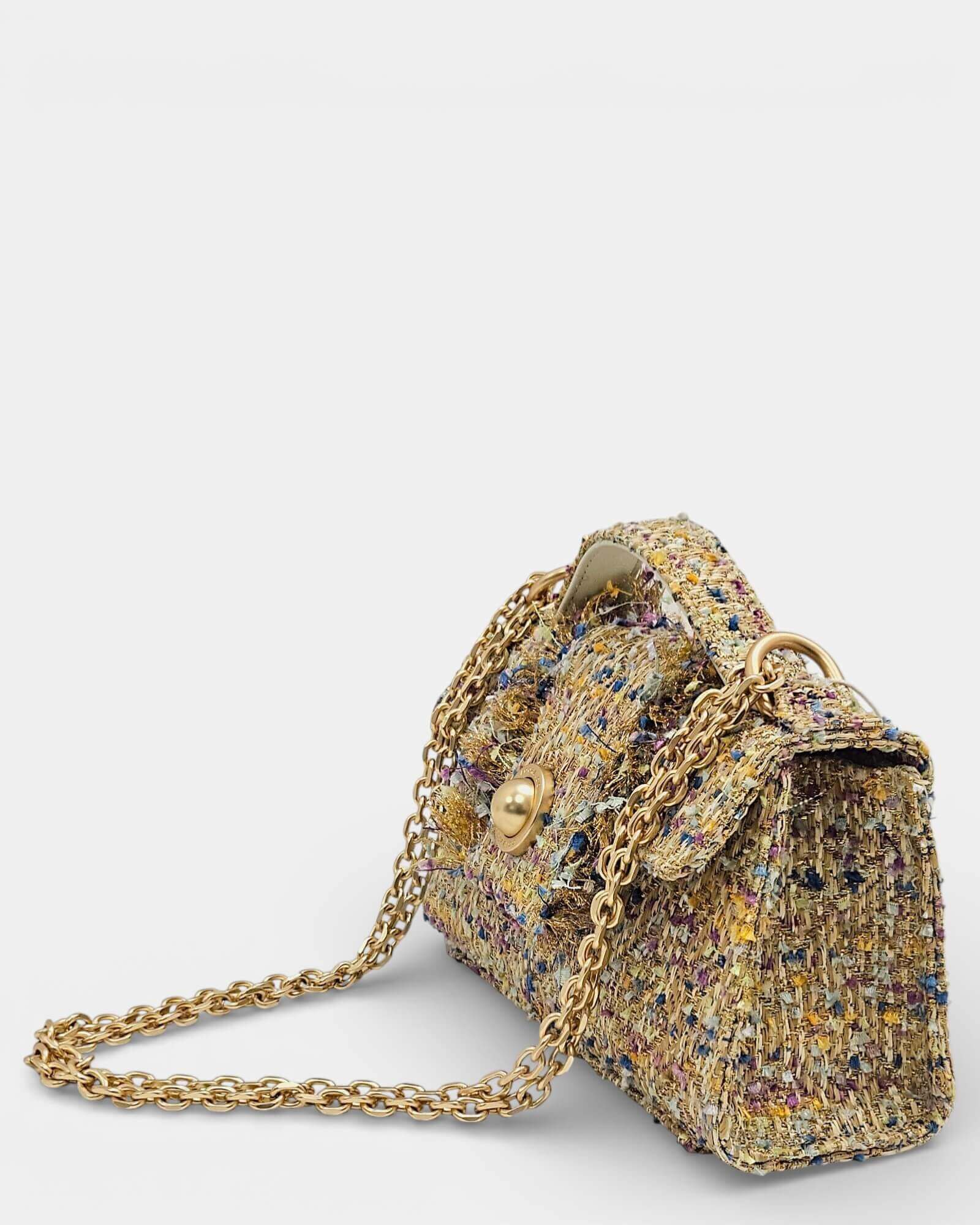 Seleccionado para nuestra colección de temporada, el modelo Noble Mini personifica el lujo táctil en su expresión más radiante y estructurada. Elaborado a mano en Atenas, esta pieza atrapa la mirada con su complejo tejido de tweed donde el amarillo cítrico se entrelaza con hilos multicolor, creando una textura rica y tridimensional. Su silueta "Noble" es compacta pero imponente, ofreciendo líneas rectas y definidas que aportan un aire de distinción inmediata. La cadena dorada deslizable añade versatilidad, permitiendo llevarlo al hombro o cruzado. Cada ejemplar es único: el forro interior, con motivos inspirados en la tradición griega, asegura que su pieza sea una obra de arte íntima y únicamente suya.