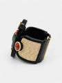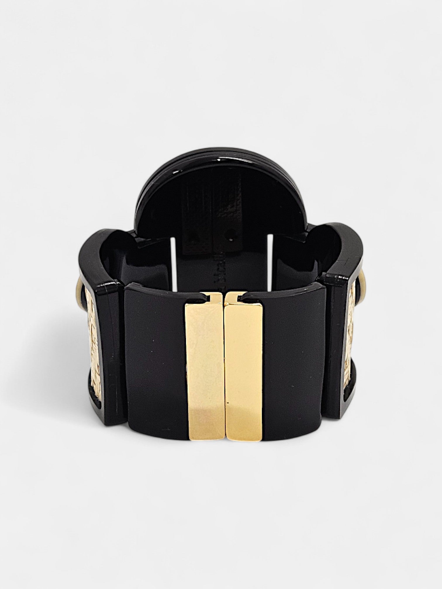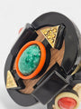 Descubre la elegancia atemporal de este brazalete Art Déco, una pieza de bisutería de autor que fusiona diseño geométrico y sofisticación. Su base en resina negra brillante resalta una incrustación de imitación madera y un cabujón ovalado en tono verde esmeralda, rodeado por un delicado aro naranja que realza su intensidad.
