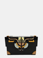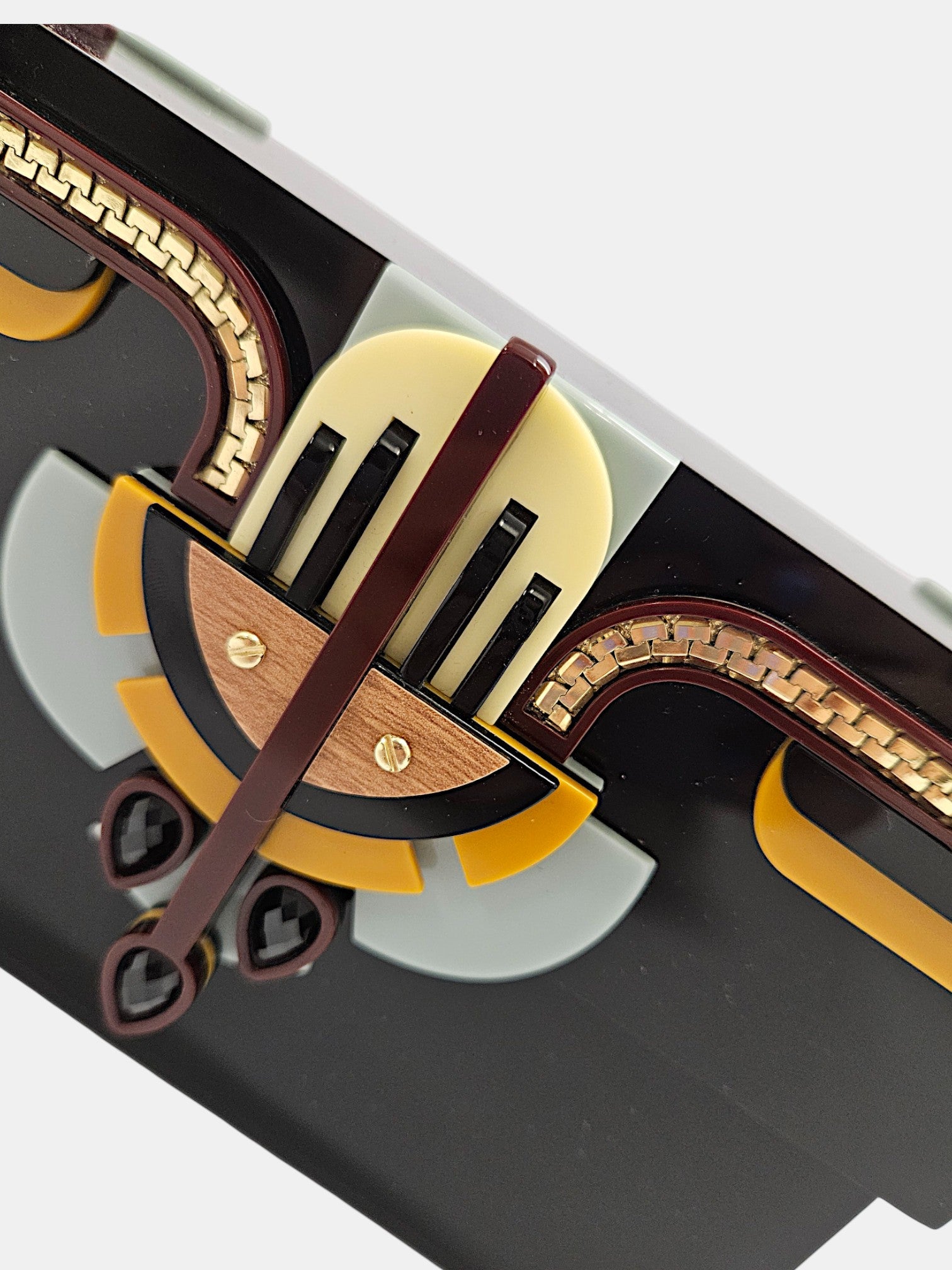 El Clutch negro de Gissa Bicalho es una pieza exclusiva de diseño brasileño, hecha a mano en acrílico con aplicaciones geométricas en tonos dorados, madera y detalles inspirados en el estilo art déco. Su estructura rígida aporta elegancia y sofisticación, mientras que la cadena dorada metálica permite llevarlo cómodamente al hombro o como bolso de mano.