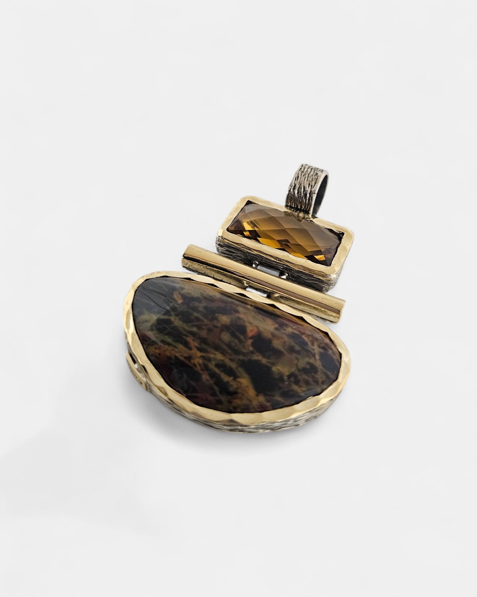 El colgante Cuarzo Whisky y Pibara es una pieza única que combina la elegancia del cuarzo whisky con la fuerza natural de la piedra Pibara. Su diseño artesanal destaca por la montura de plata labrada con detalles en oro, que enmarca con sutileza las piedras y realza sus tonos cálidos y terrosos.