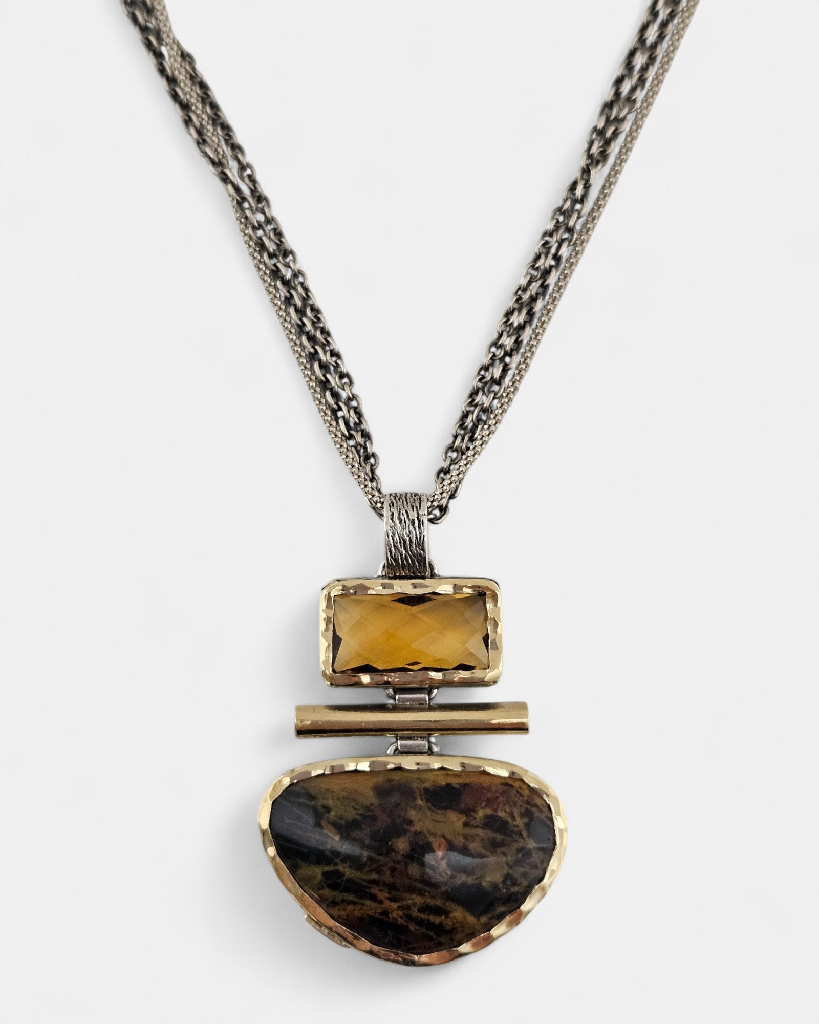 El cuarzo whisky, con su brillo ámbar facetado, aporta luz y sofisticación, mientras que la piedra Pibara, con sus vetas oscuras y naturales, transmite equilibrio y conexión con la tierra. Juntas, forman un colgante de gran presencia y estilo atemporal.