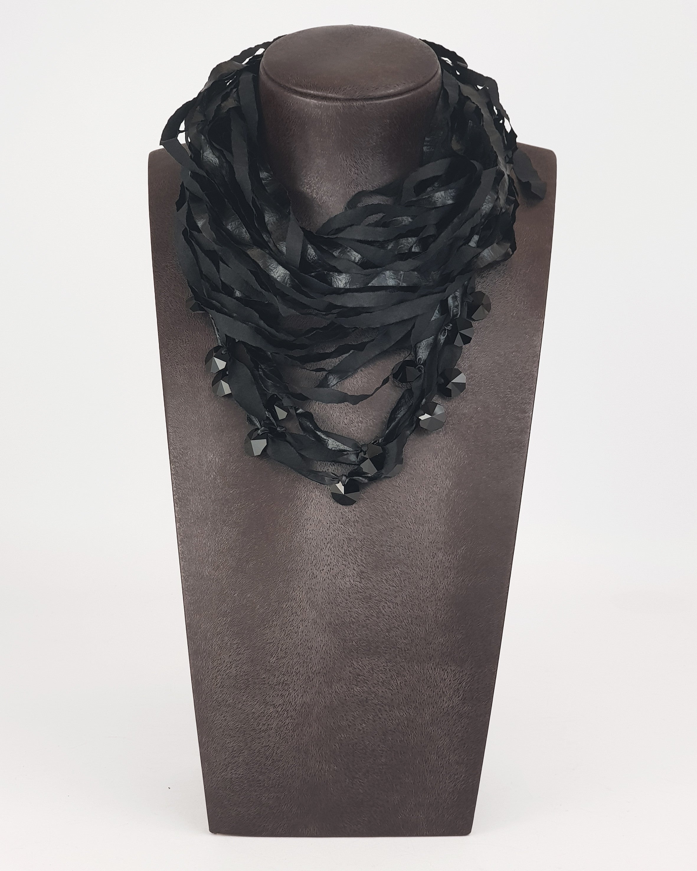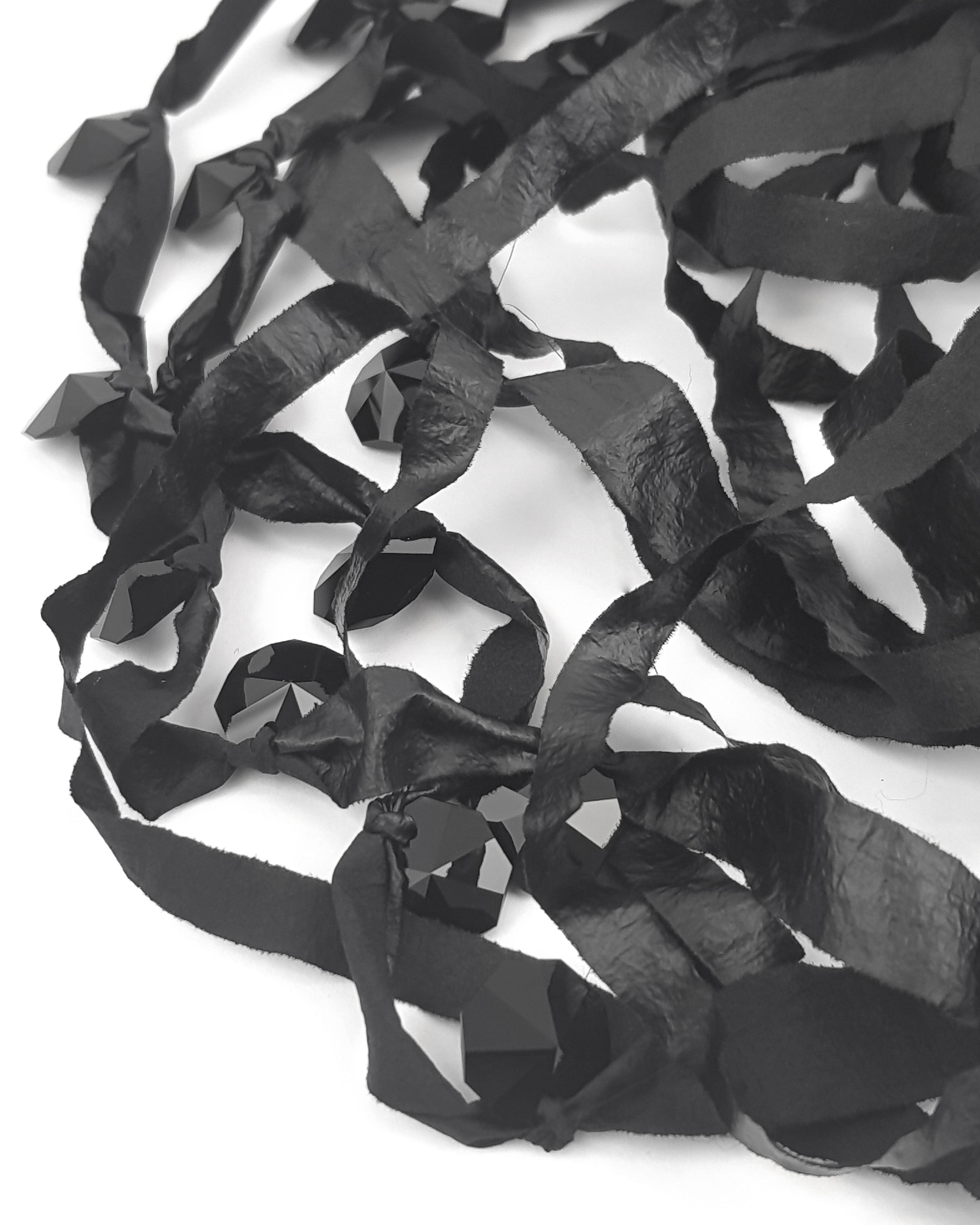 Realizado artesanalmente con cristales facetados y tejido metalizado en color negro