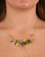 Collar corto con flores en color amarillo y lila hecha artesanalmente en resina esmaltada con chapado de oro y cristal