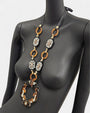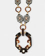 El collar Gissa Bicalho en acrílico negro, blanco y marrónes una joya artesanal de inspiración art déco, con un diseño geométrico que combina elegancia y originalidad. Su estructura incluye eslabones decorados con detalles dorados y un gran colgante central en forma de aro, creando un accesorio escultural y sofisticado.