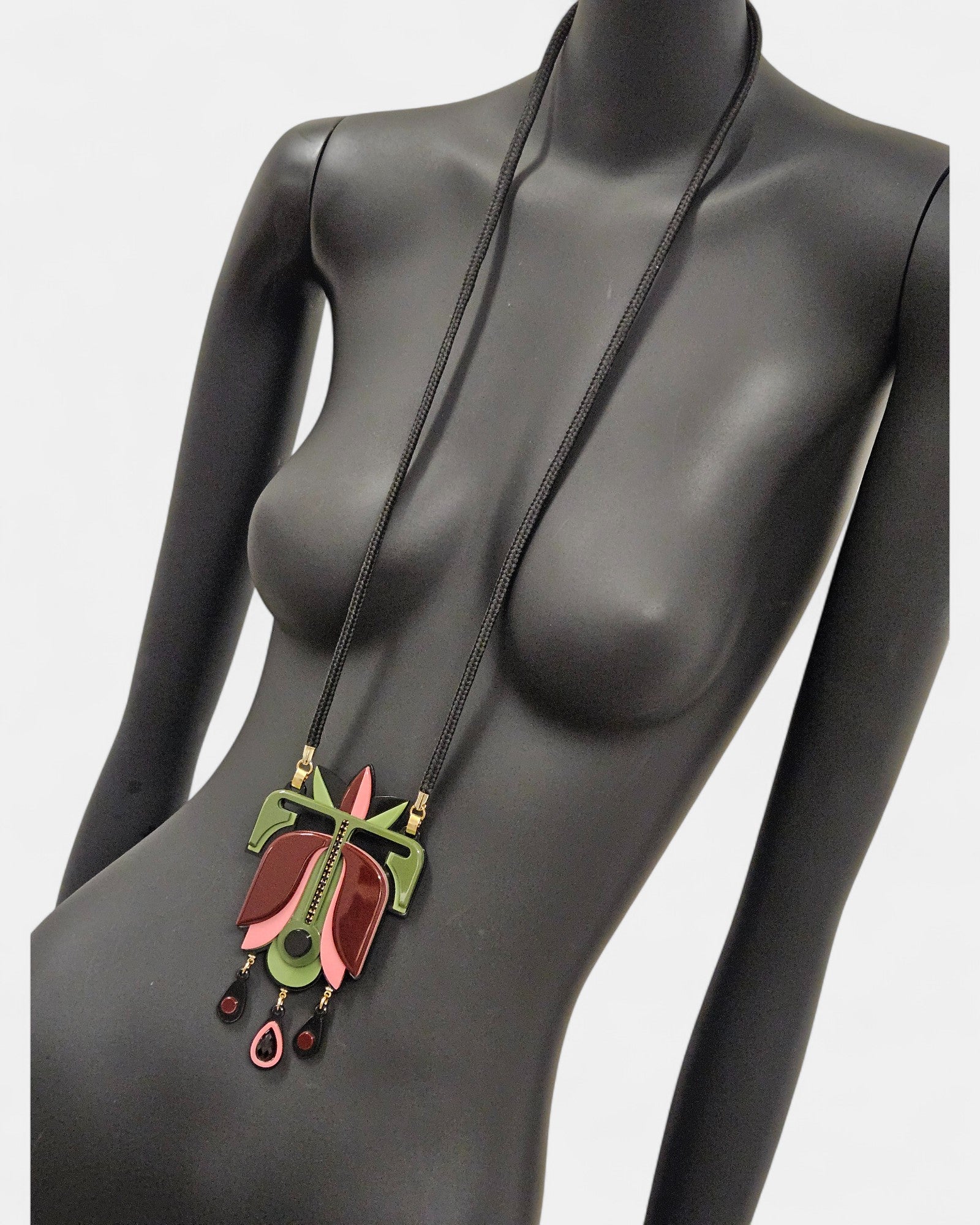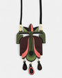 El collar largo de Gissa Bicalho es una joya artesanal que combina acrílico en tonos rosa, verde y negro con un diseño escultórico de inspiración geométrica. Su colgante central, decorado con piezas colgantes móviles, aporta dinamismo y elegancia, convirtiéndolo en un accesorio protagonista ideal para elevar cualquier look.