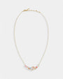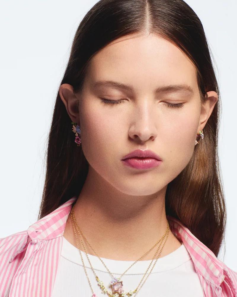 Collar pechera compuesto por flores esmaltadas a mano: malvarrosas y flores de hortensia en azul, rosa y blanco.
