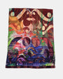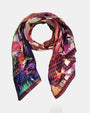 Foulard con estampado y colores naranja, morado, gris, azul y verde.