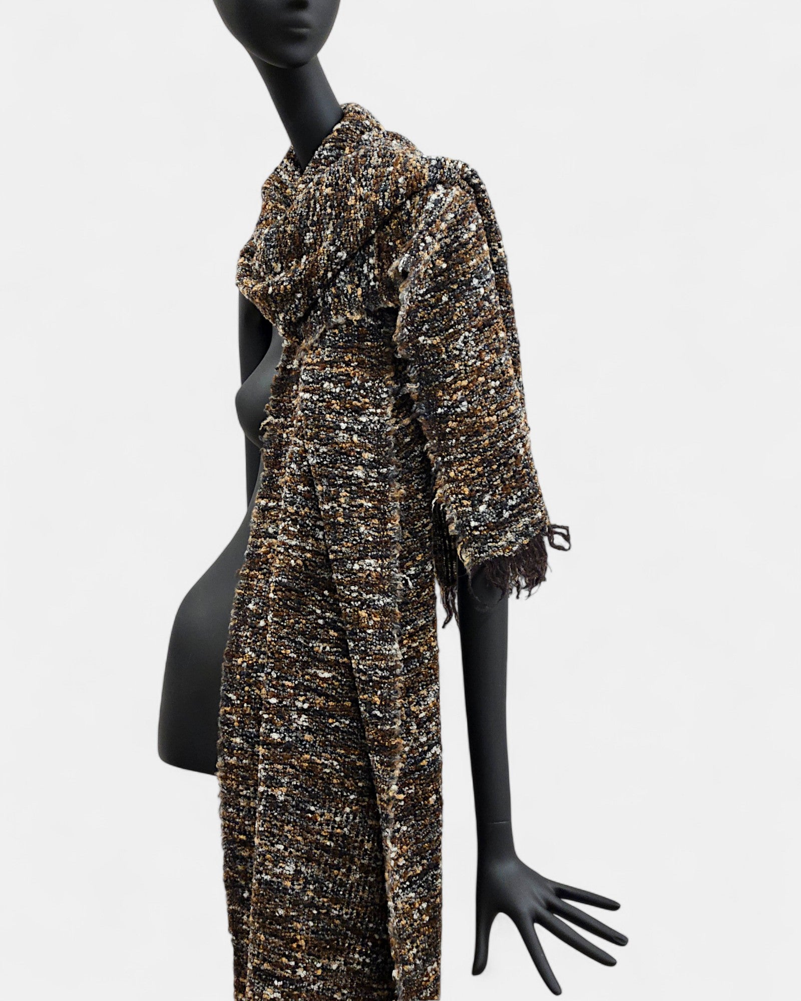 El Fular “Nery” de Faliero Sarti es un complemento elegante que combina los tonos otoñales oscuros —marrón profundo, gris carbón y matices tierra— con una textura bouclé que aporta volumen, calidez y estilo. Su diseño permite usarlo como estola o envolverlo generosamente al cuello para los días frescos.