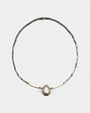 Elegante collar rígido de la diseñadora Gabriela Styliano, elaborado artesanalmente en plata oxidada 925 con acentos en oro amarillo de 18 quilates.