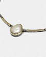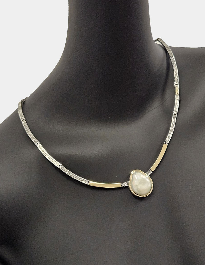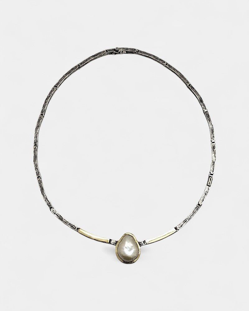 Esta joya combina la fuerza de los metales nobles con la delicadeza de la perla, logrando una estética orgánica, elegante y contemporánea.