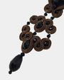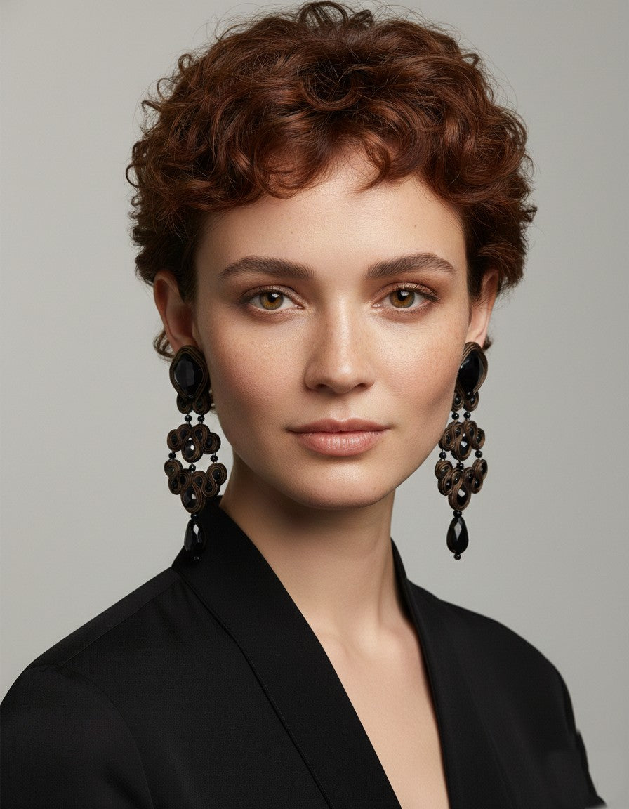 Hemos seleccionado el modelo Gótico en su versión Azabache Madera porque es una auténtica clase magistral de contrastes y dramatismo sofisticado. Nos fascina cómo este diseño reinterpreta el romanticismo oscuro a través de una lente puramente contemporánea. La profundidad insondable del negro azabache dialoga de manera sublime con la calidez terrenal del marrón, todo ello enmarcado por los impecables cordones de seda característicos de la firma. Es esa pieza statement capaz de inyectar autoridad a cualquier look, convirtiendo la sobriedad en puro magnetismo visual. Pero su verdadero triunfo, y el secreto que aman las estilistas, reside en la ingeniería textil del soutache: a pesar de su imponente silueta, estos pendientes te garantizan una ingravidez total. Es la inversión definitiva para la mujer que busca acaparar miradas con un aura inquebrantable, desde la cena hasta la madrugada.