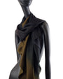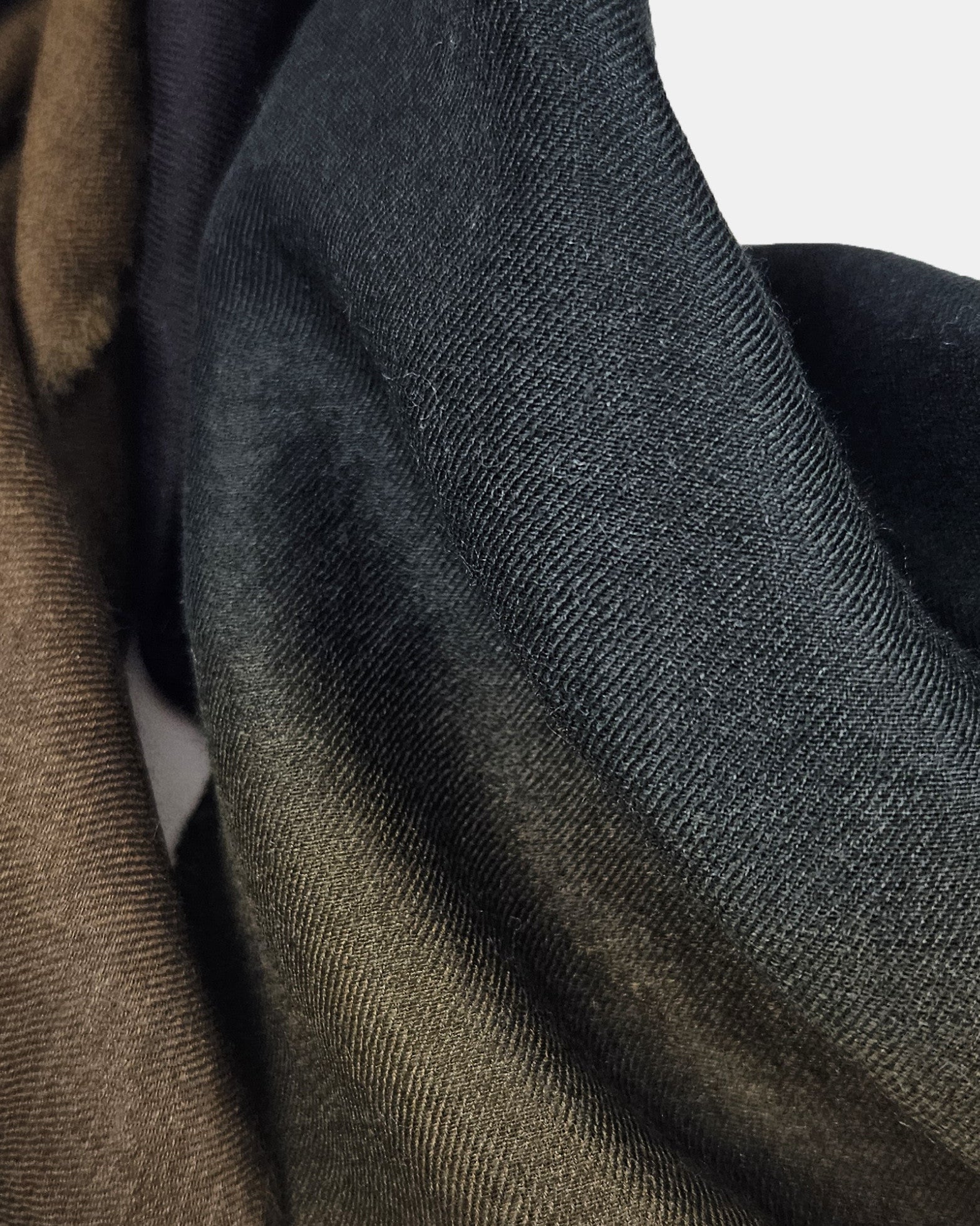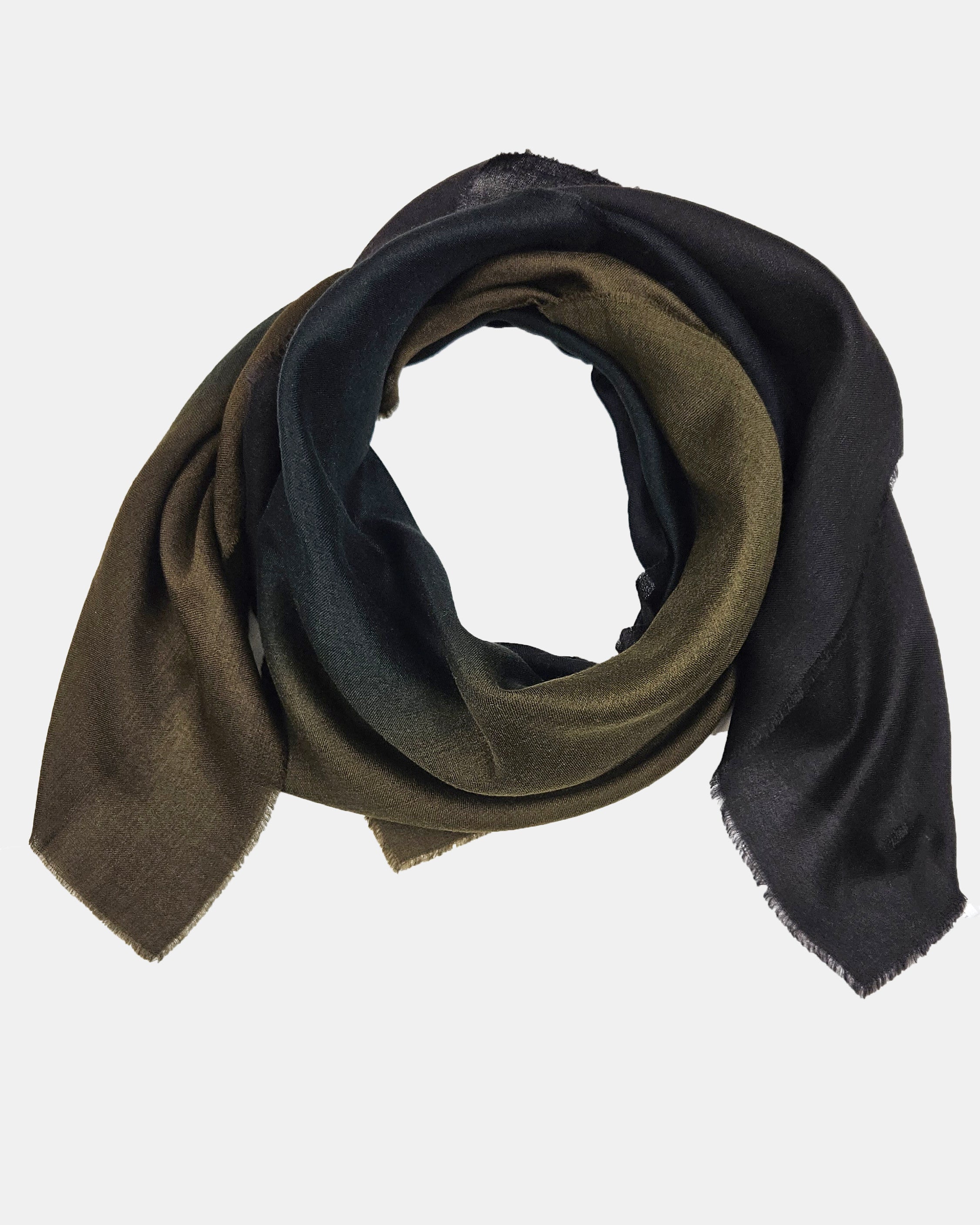 Pañuelo tejido en camel y seda en colores degradados en verde y marrón