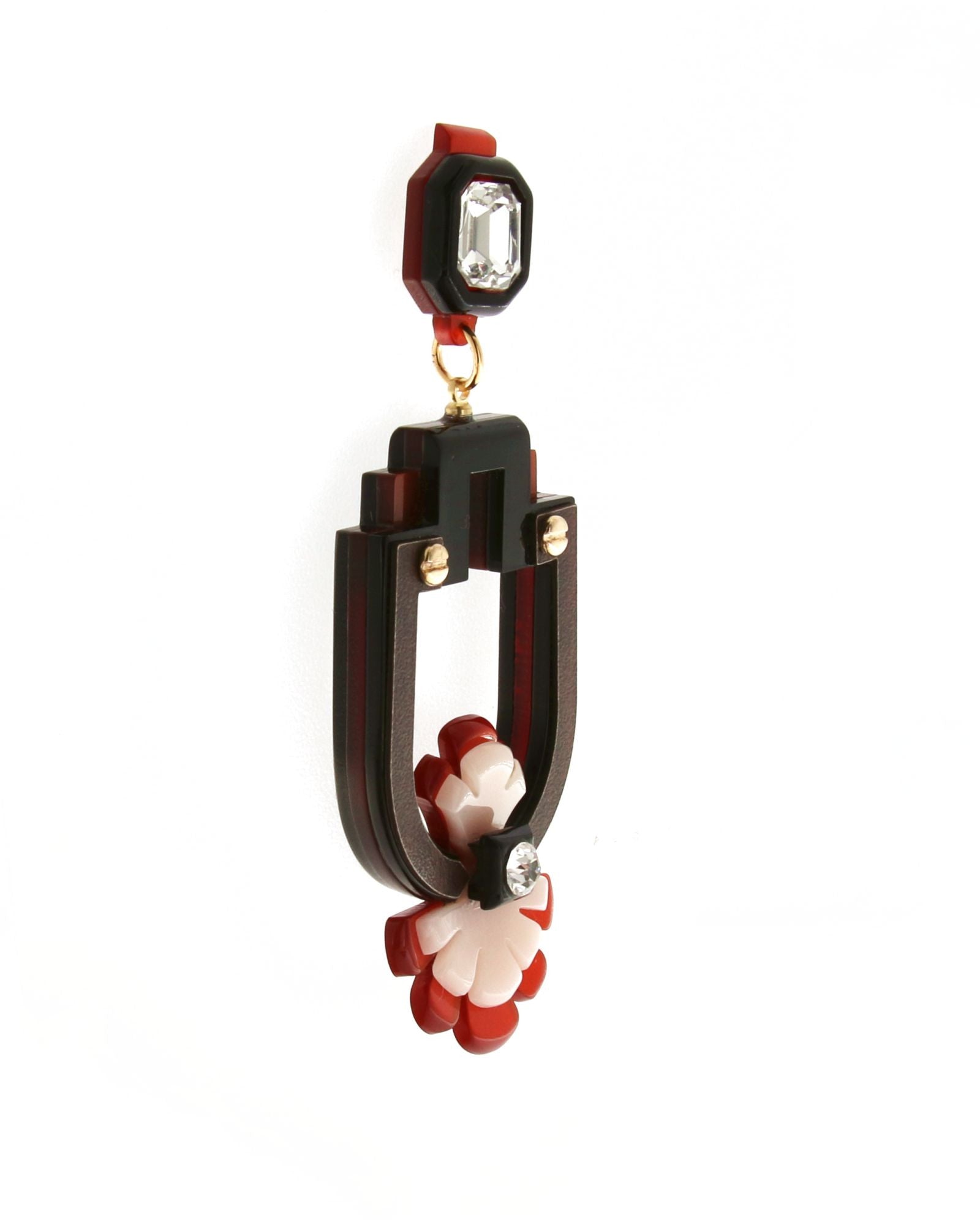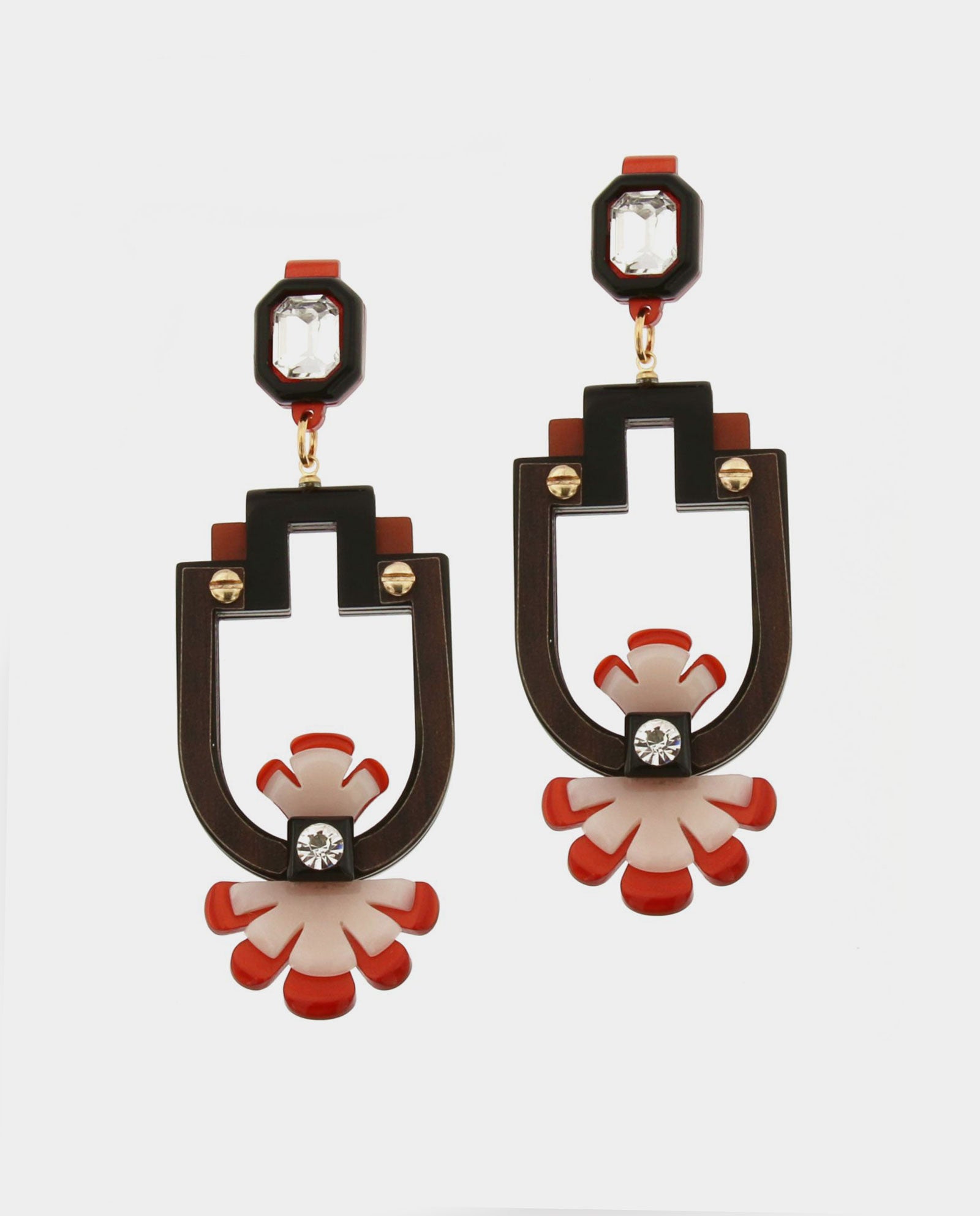 Pendiente de resina con diseño geométrico y flor combinando los colores negro, rosa y marrón decorado con cristal