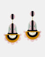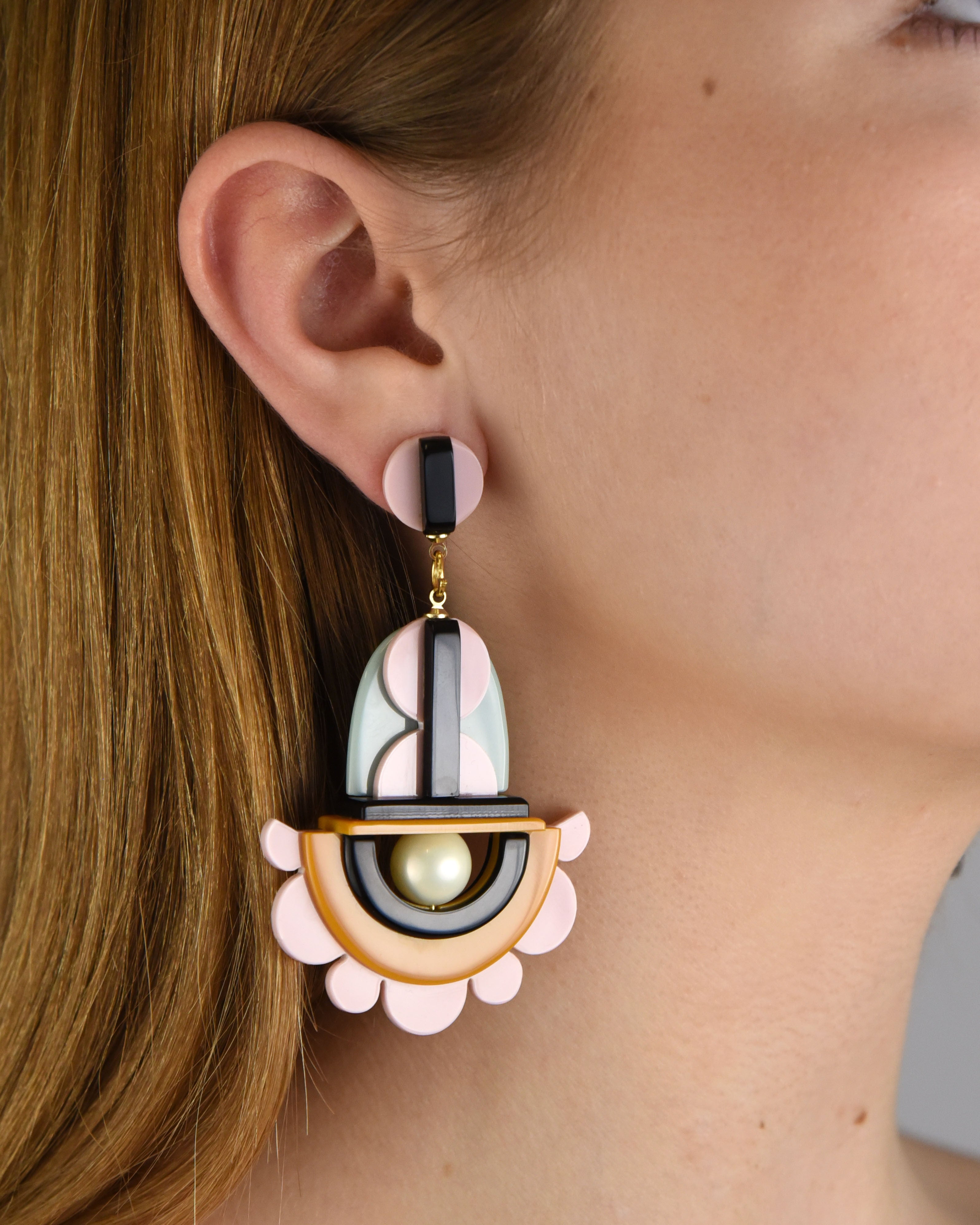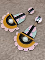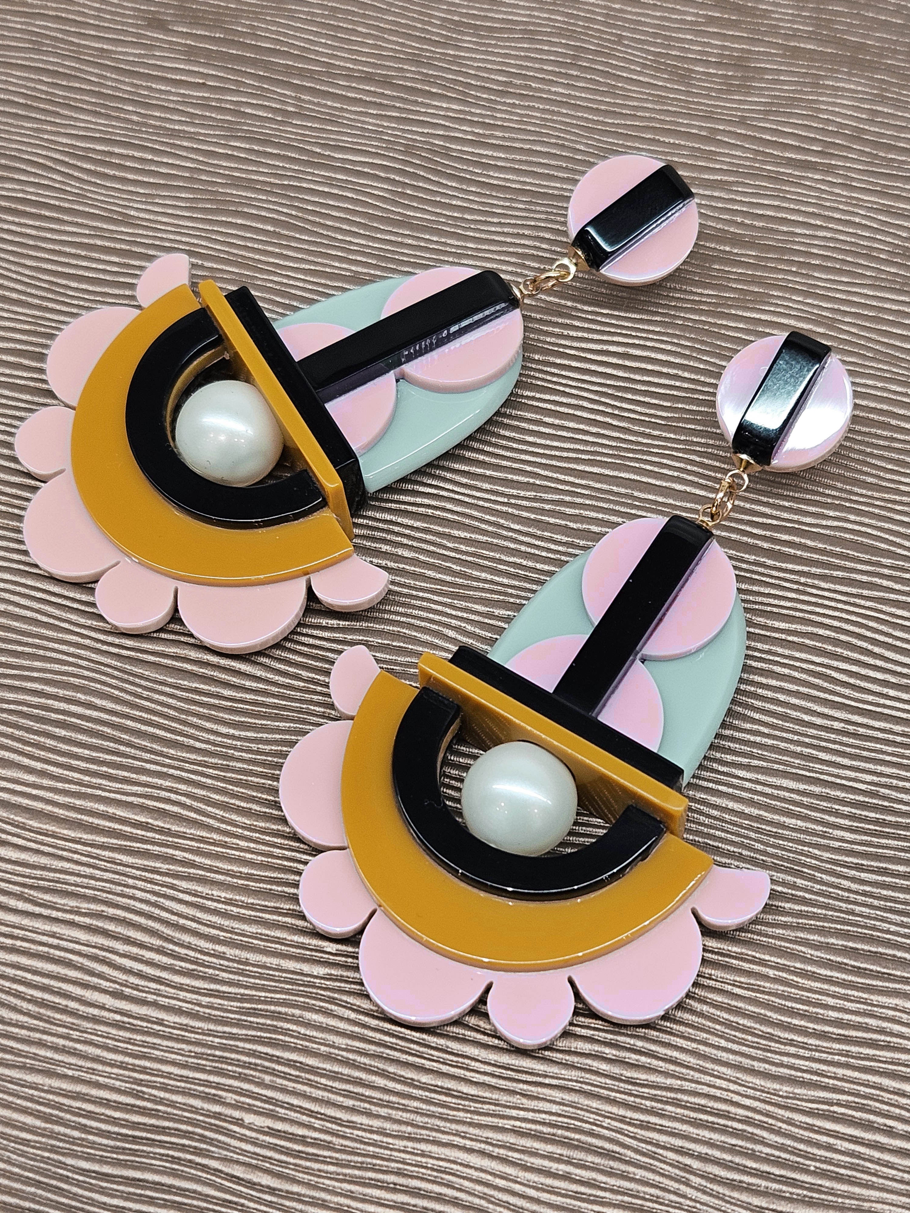 Pendiente de resina con diseño geométrico en colores rosa, mostaza, azul y negro decorado con una perla