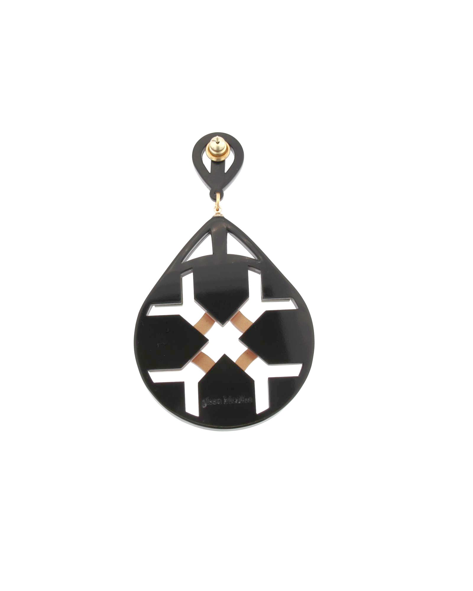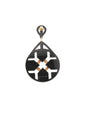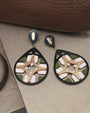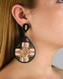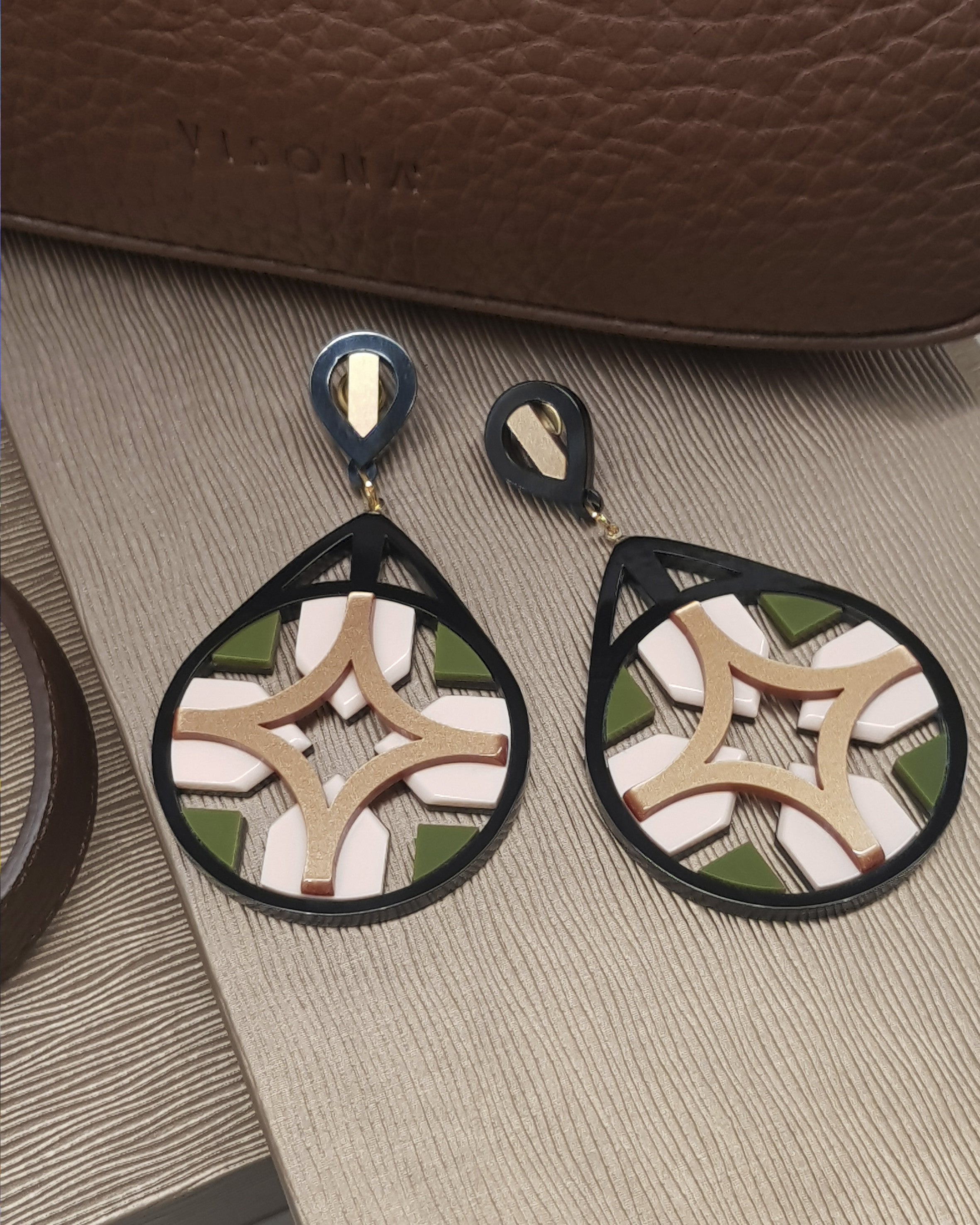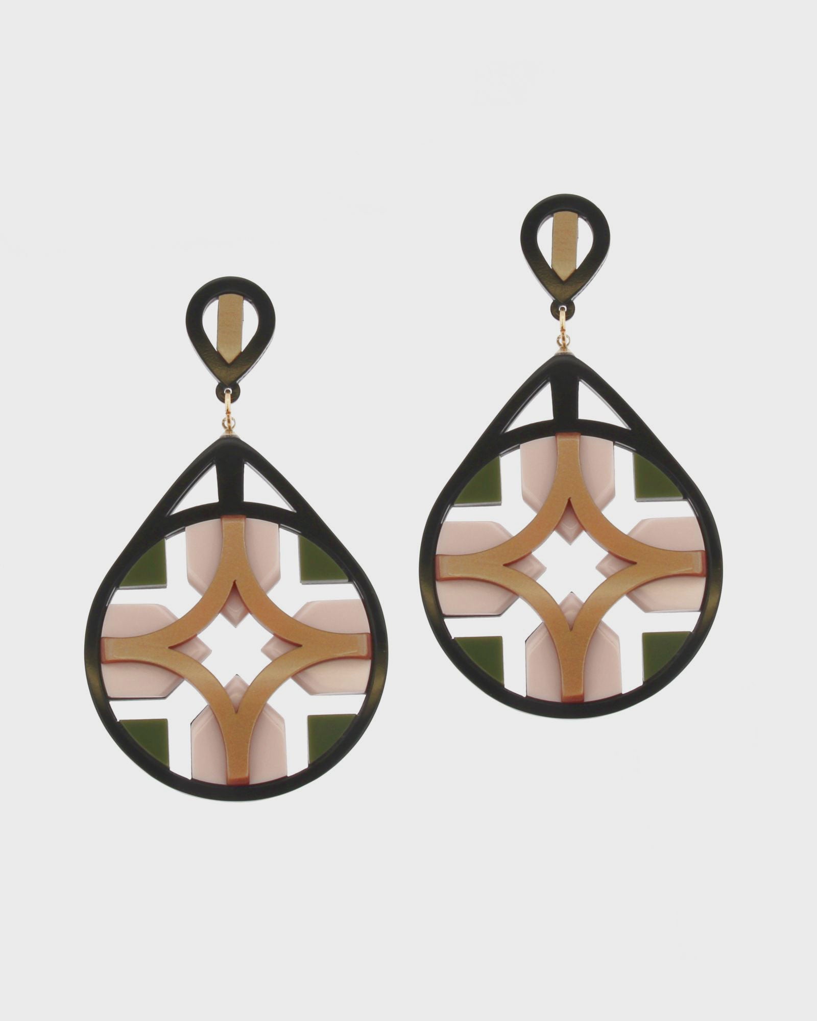 Pendiente de resinas superpuestas con diseño geométrico en colores rosa, verde, oro y negro
