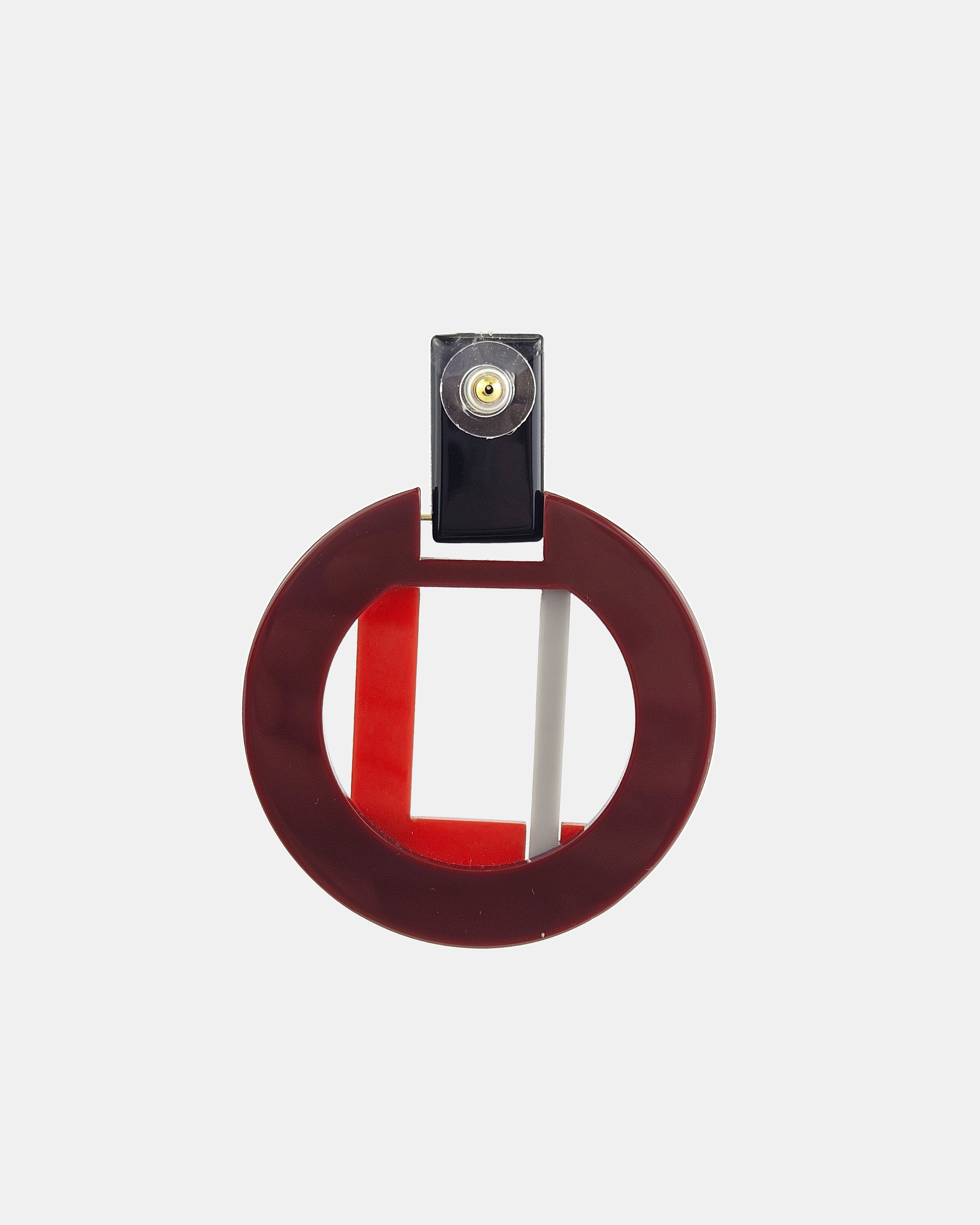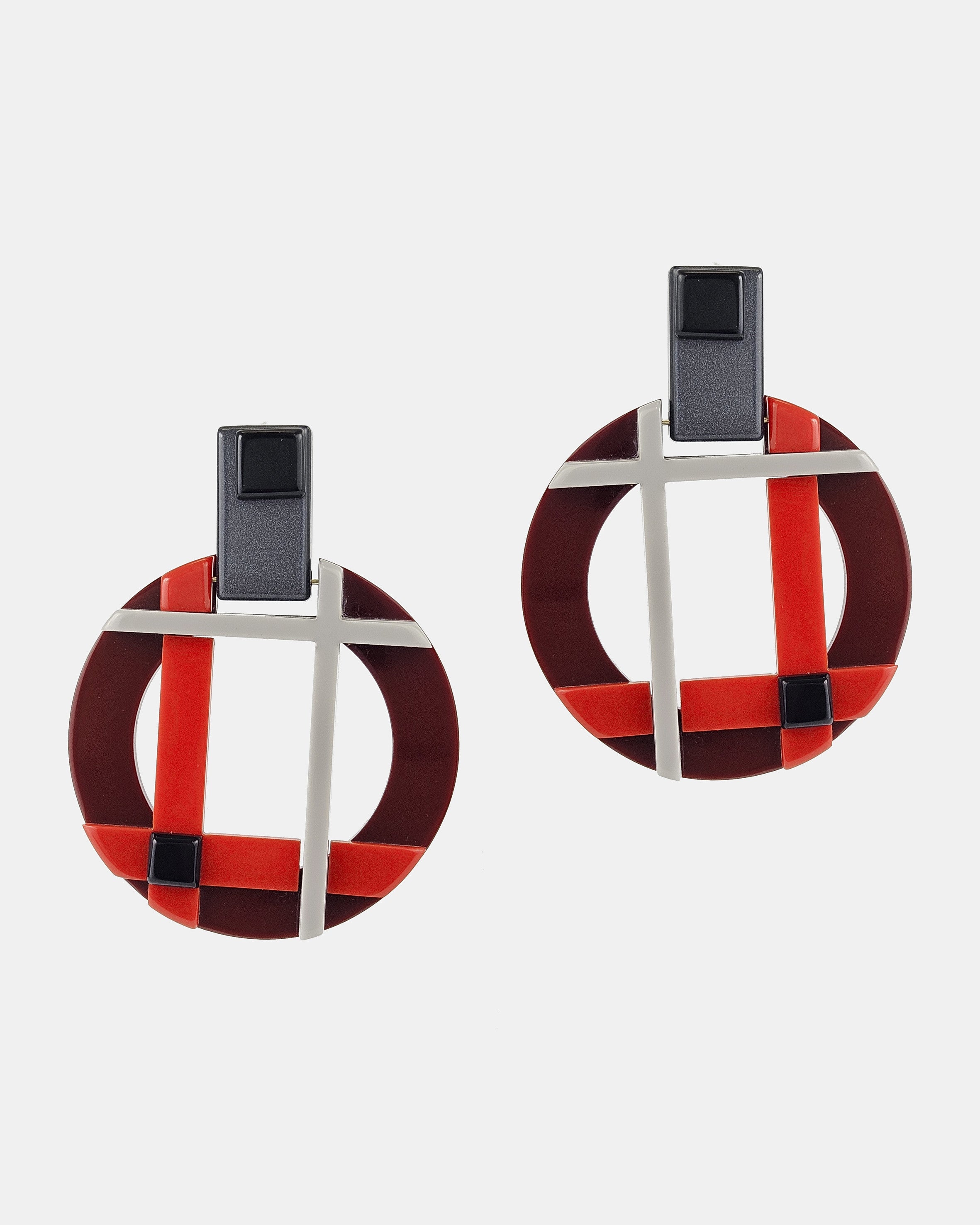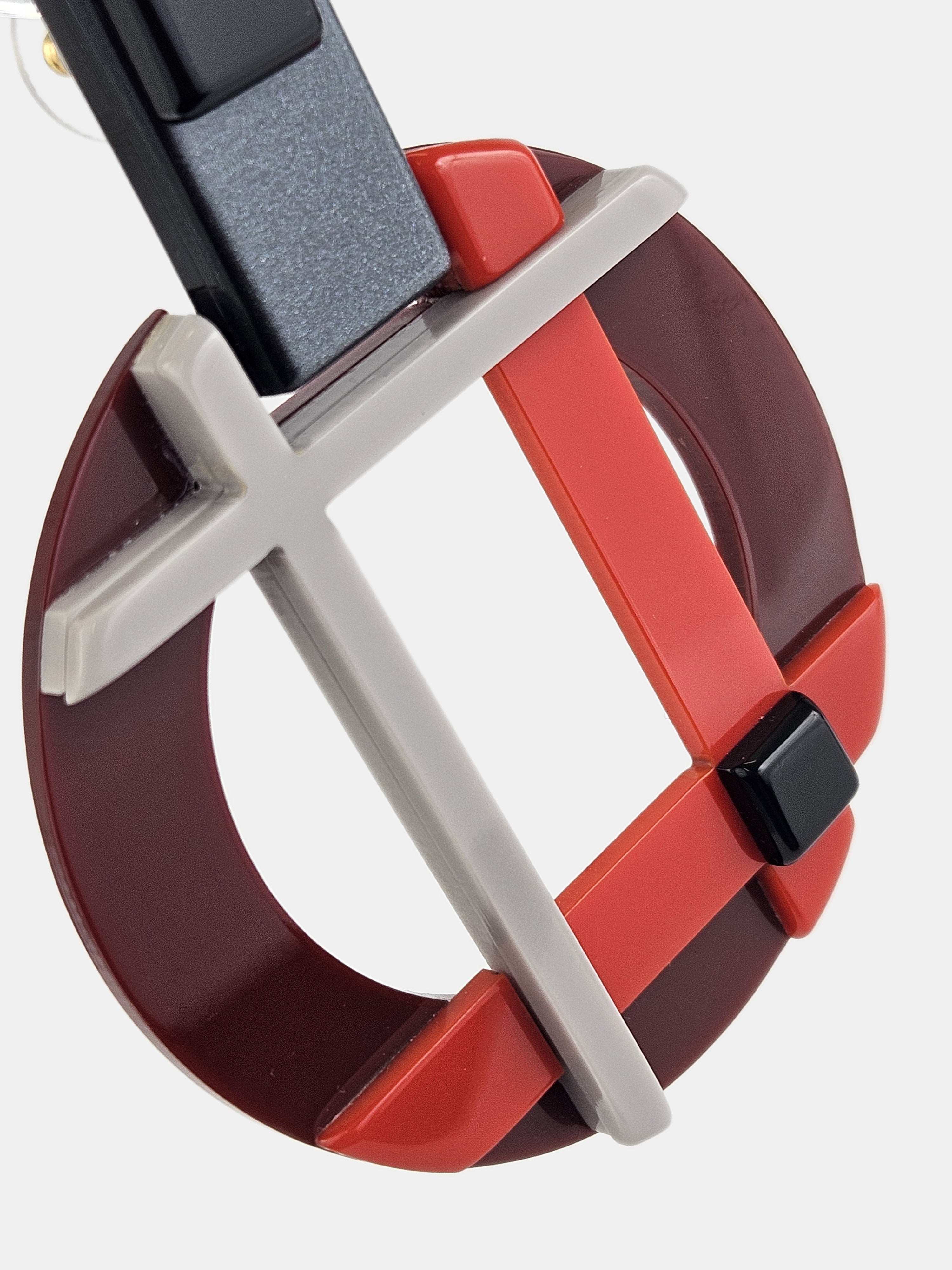 Pendiente articulado de resina con diseño geométrico en negro, granate, gris y rojo.