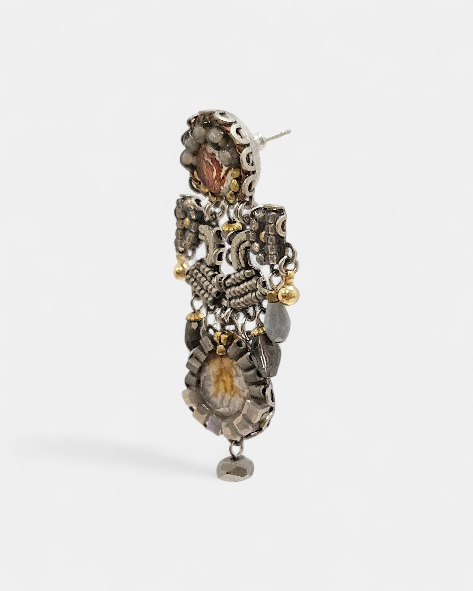 La estructura en tono plateado envejecido, junto con las cuentas doradas y las piezas facetadas, crea un juego de luces que realza cualquier look. Son ideales para ocasionas especiales, pero también para elevar un conjunto más casual con un toque de distinción.