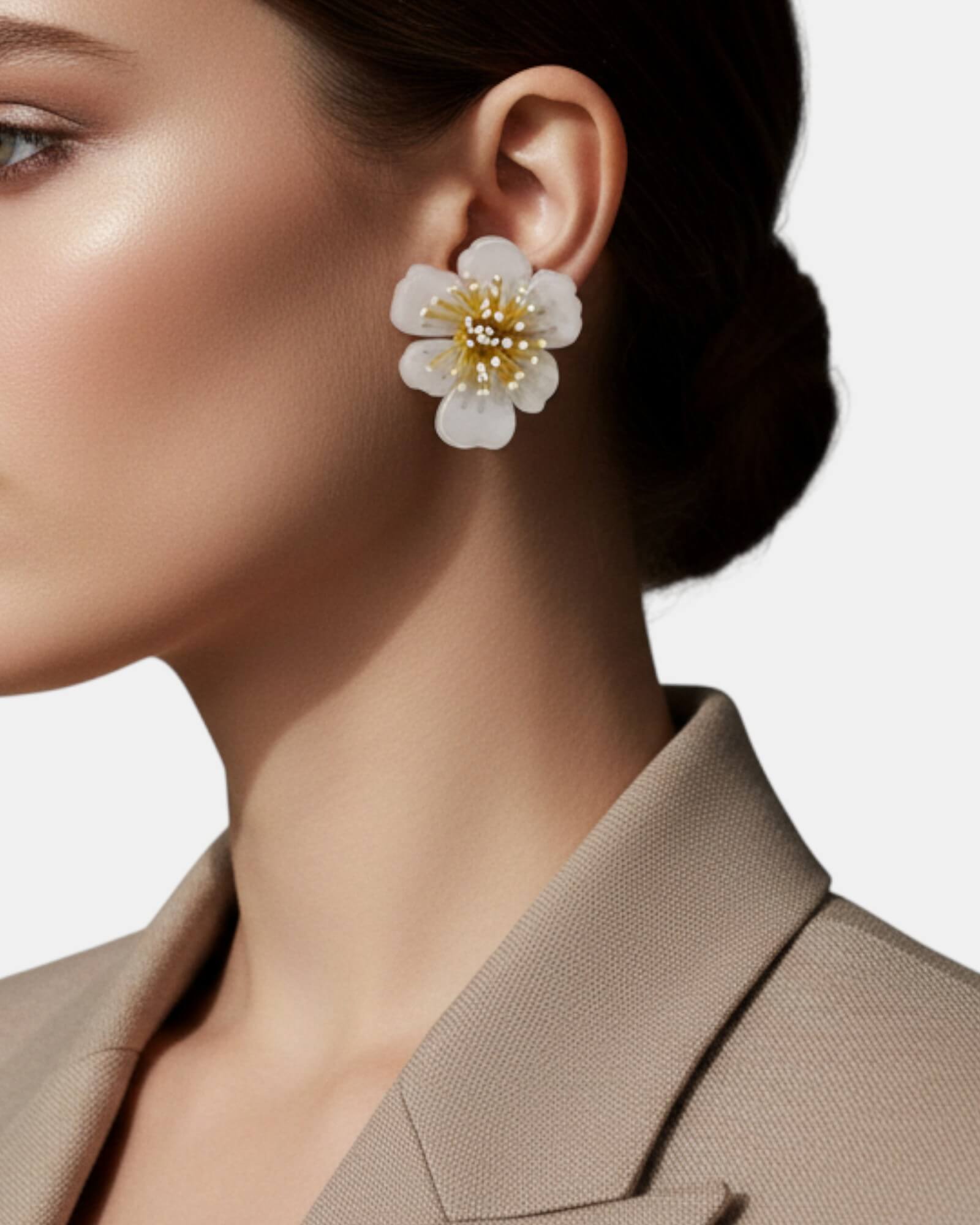 Eleva tu estilismo con la elegancia etérea de estos pendientes de resina de Ciléa Paris. Este modelo destaca por su acabado blanco translúcido y el exquisito grabado de líneas verticales en sus pétalos, que crean un juego de luces único. Es una pieza de artesanía francesa perfecta para novias contemporáneas o invitadas que buscan un toque de luz absoluta.