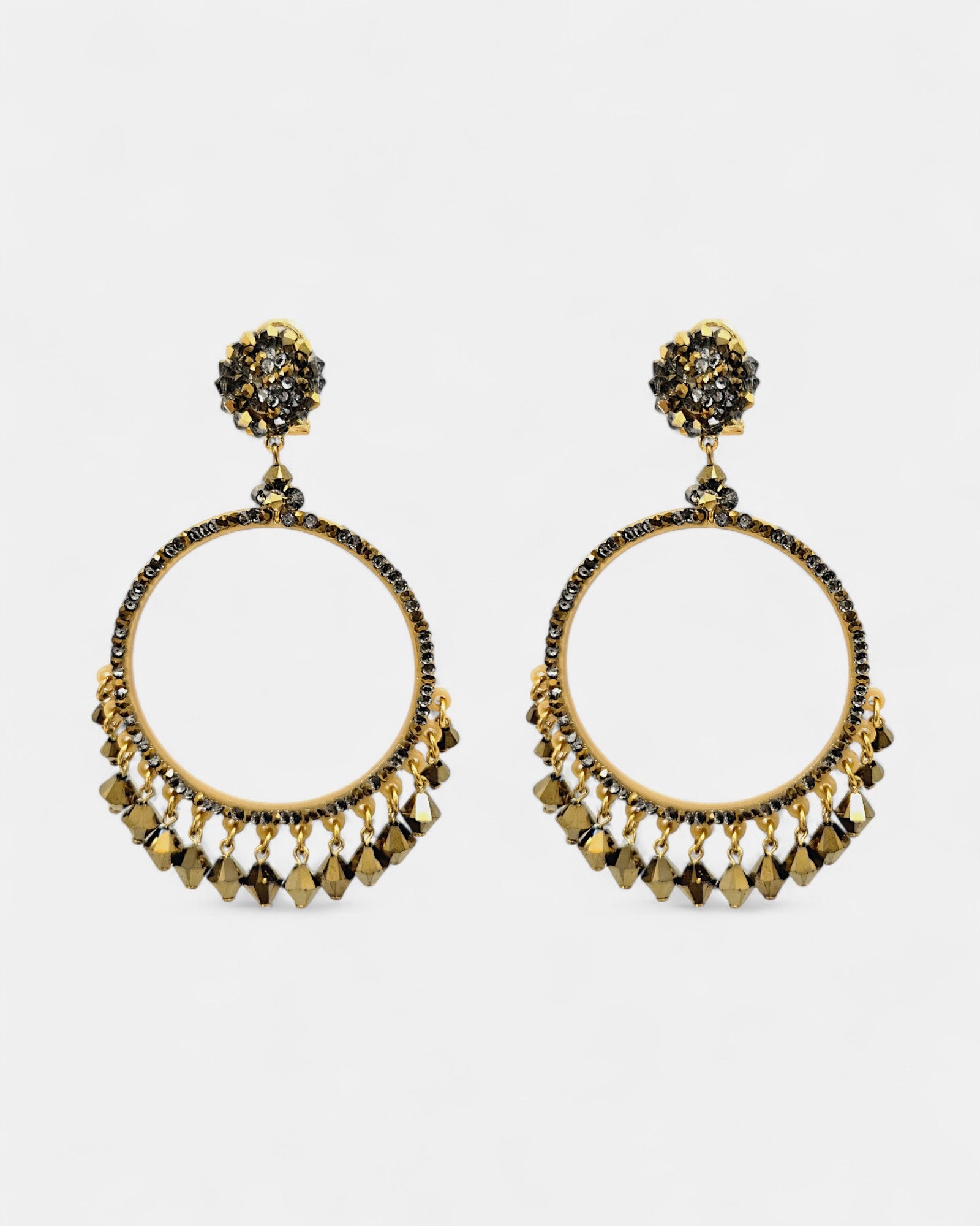 El diseño circular aporta un aire atemporal, mientras que los detalles en cristales oscuros añaden un toque moderno y sofisticado. Perfectos para bodas, fiestas nocturnas o looks de invitada, estos pendientes aportan estilo y personalidad sin perder la comodidad.