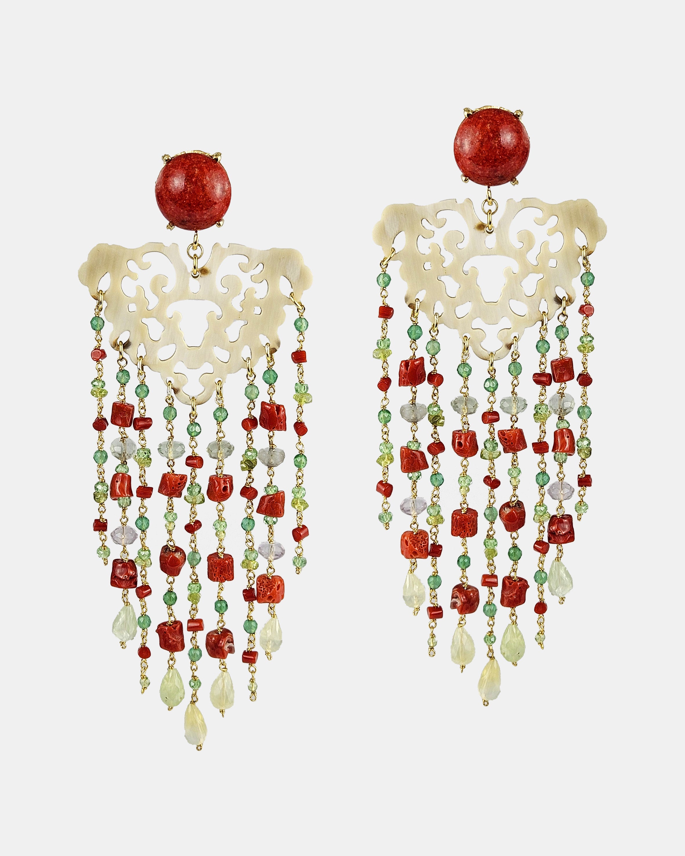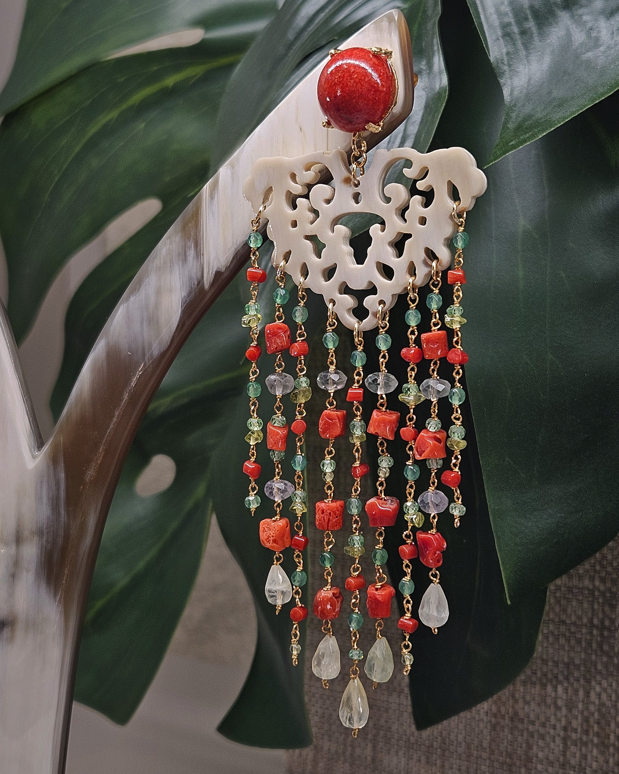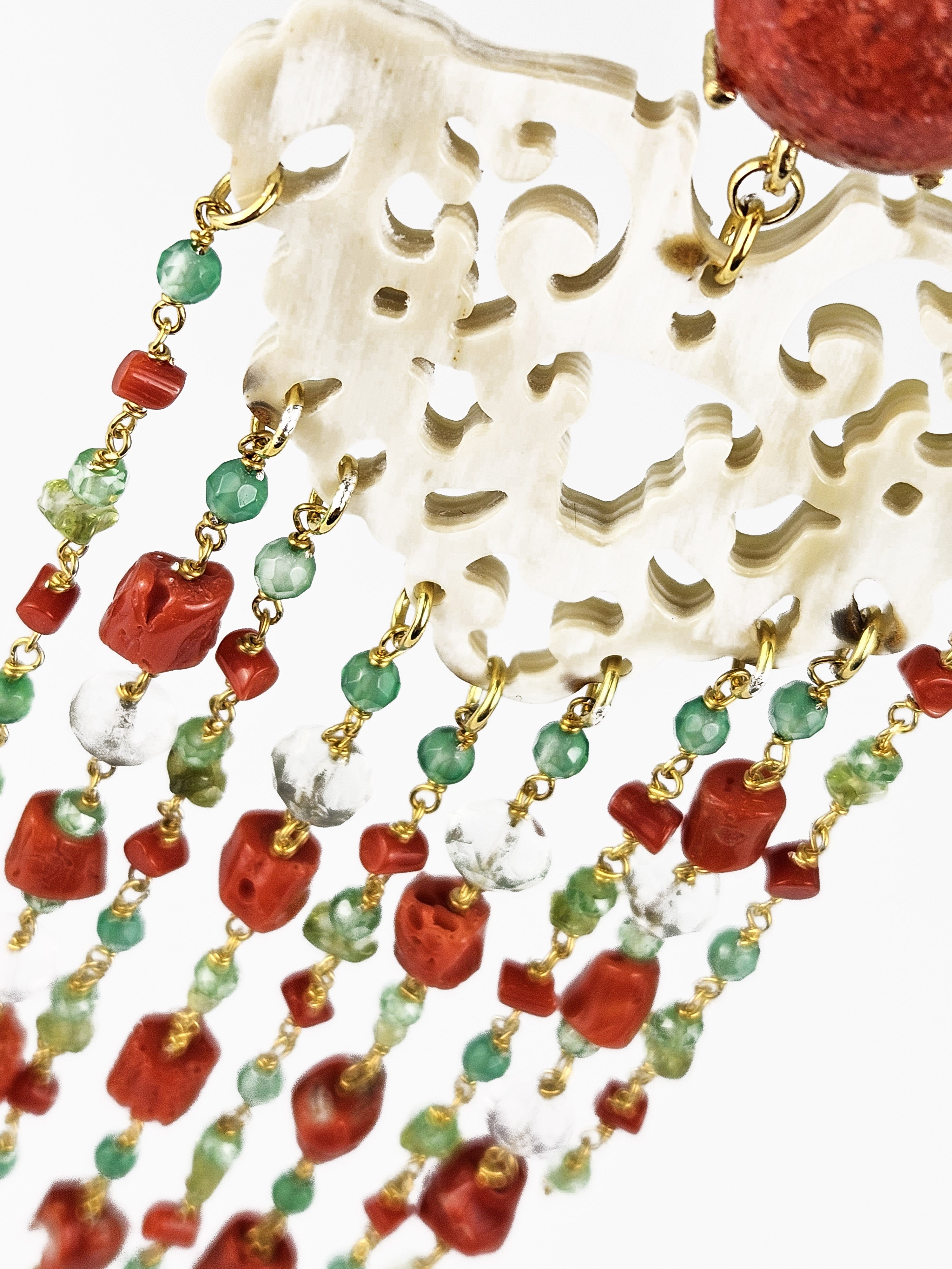 Diseño de chandelier en cuerno con cascada de corales y piedras semipreciosas