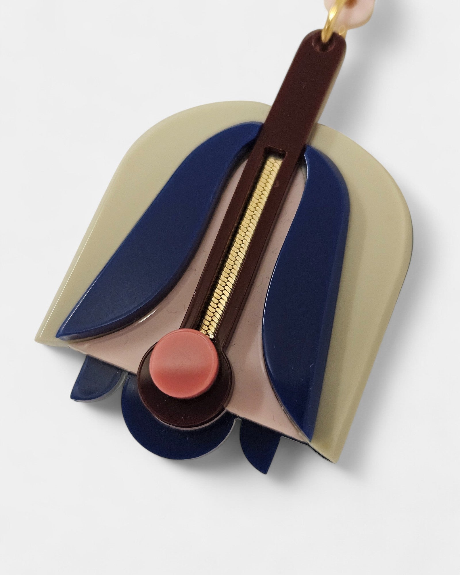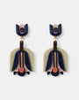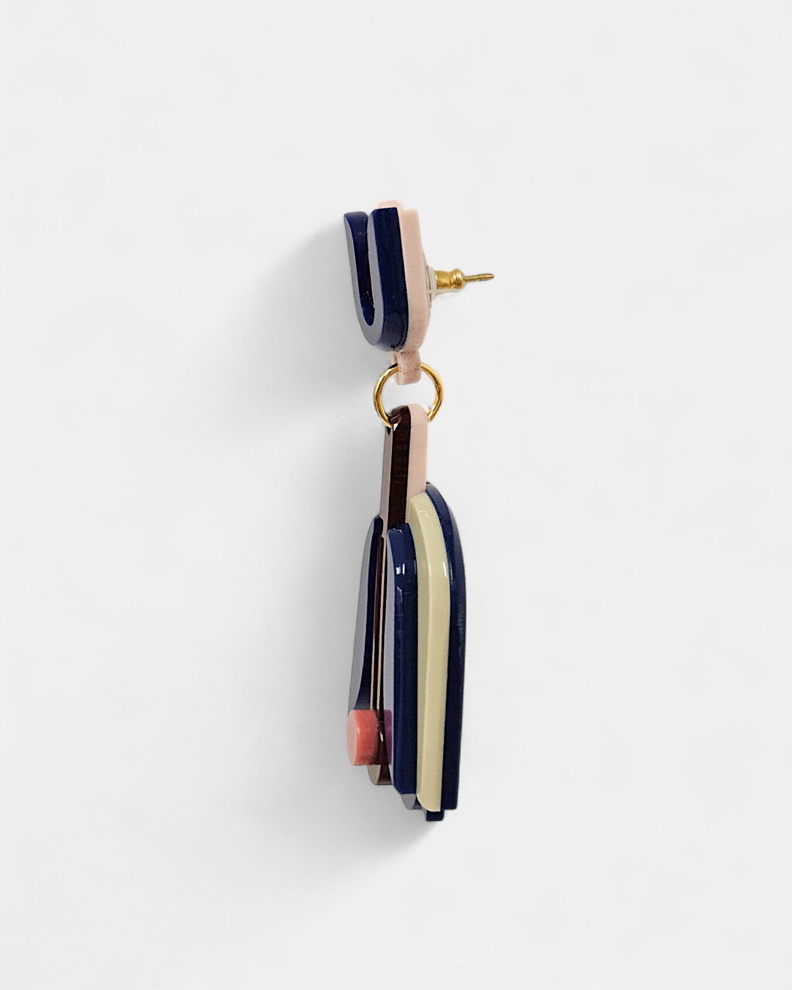 Fabricados en resina de alta calidad en tonos azul marino, verde oliva y nude, con un detalle coral que resalta en el diseño, estos pendientes destacan por su original composición geométrica inspirada en formas florales. El aplique metálico central añade un acabado moderno y elegante, perfecto para realzar cualquier look.