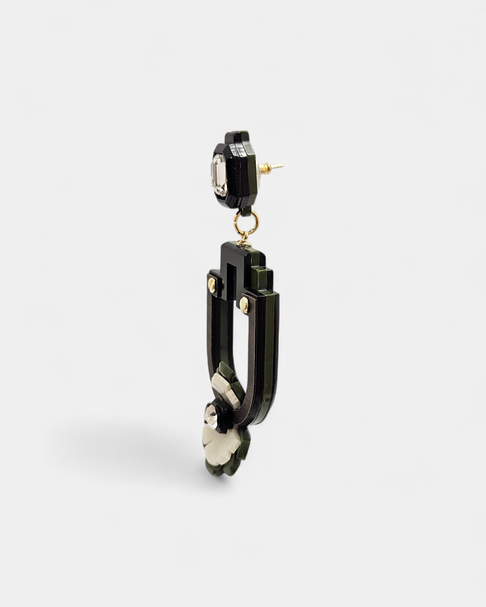 El diseño combina resina en negro, verde y marfil, realzada con pequeños detalles metálicos dorados que recuerdan a piezas arquitectónicas. En la parte superior, un cristal rectangular aporta brillo discreto, mientras que en el extremo inferior una flor estilizada con un cristal central ilumina el conjunto.