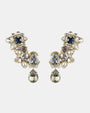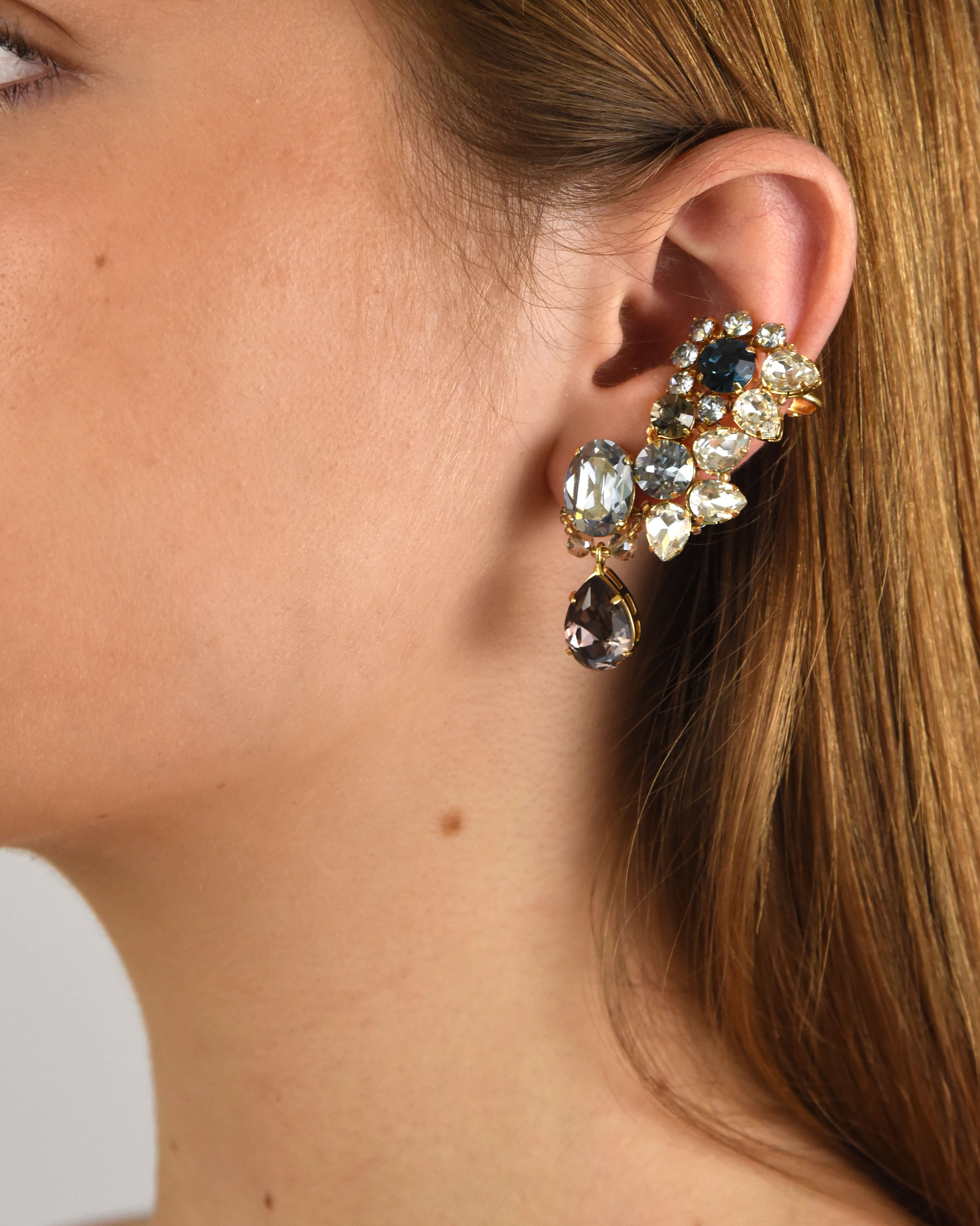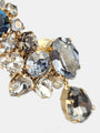 Cristales transparentes engastados a mano en distintas tallas y tonos bruma, azules y gris oscuro.