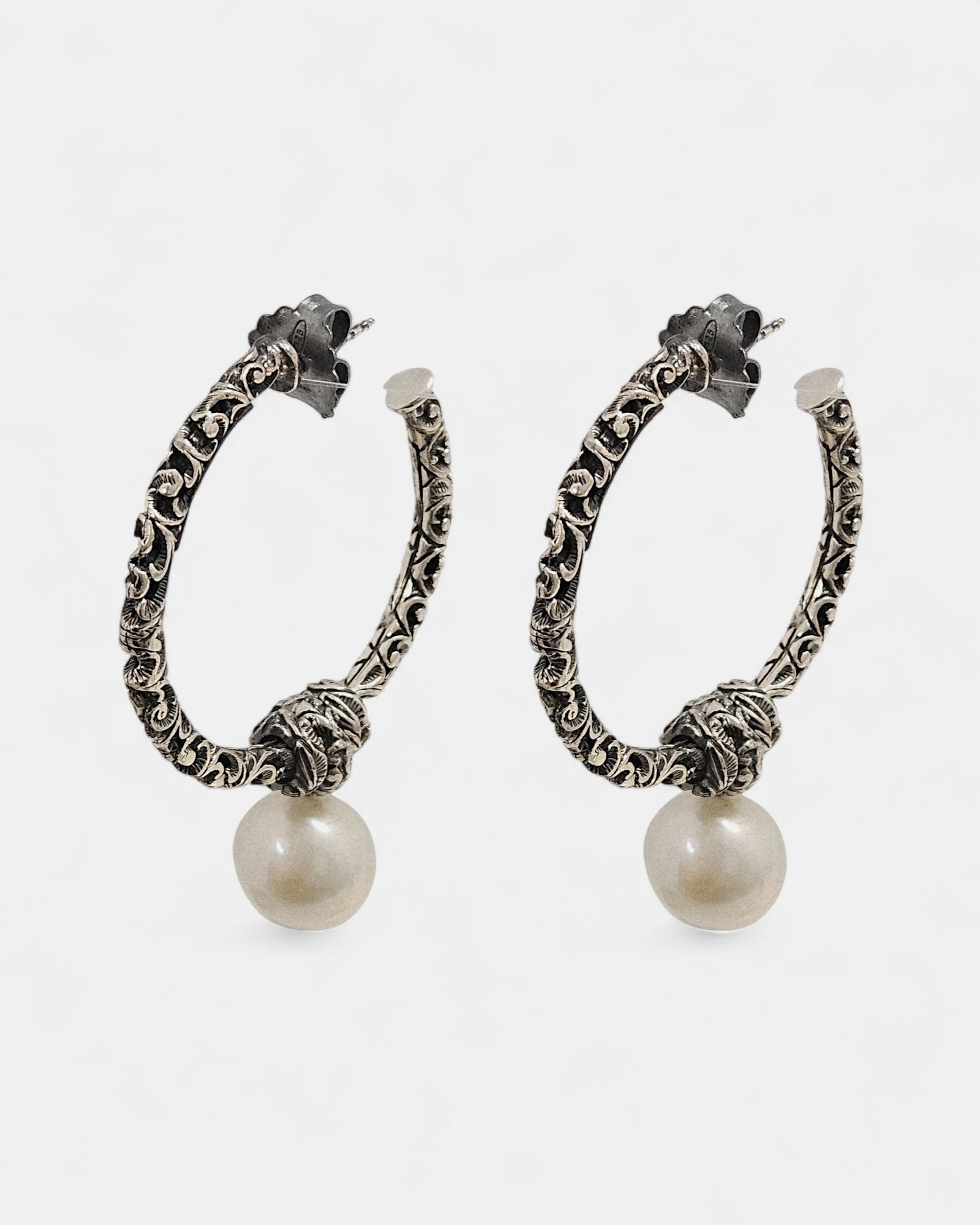 Los Pendientes “Giulia” de María Luisa Jewels son una joya que combina la fuerza de la plata envejecida con la delicadeza de la perla natural. Elaborados por expertos orfebres italianos, cada aro ha sido trabajado con la antigua técnica del buril, logrando un cincelado en relieve de inspiración clásica.