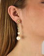 Su estructura dorada resalta el brillo de las piedras, mientras que el colgante de perla aporta equilibrio y movimiento al diseño. Todas las joyas de la firma son hipoalergénicas y libres de níquel, perfectas para cuidar la piel sin renunciar al lujo.