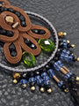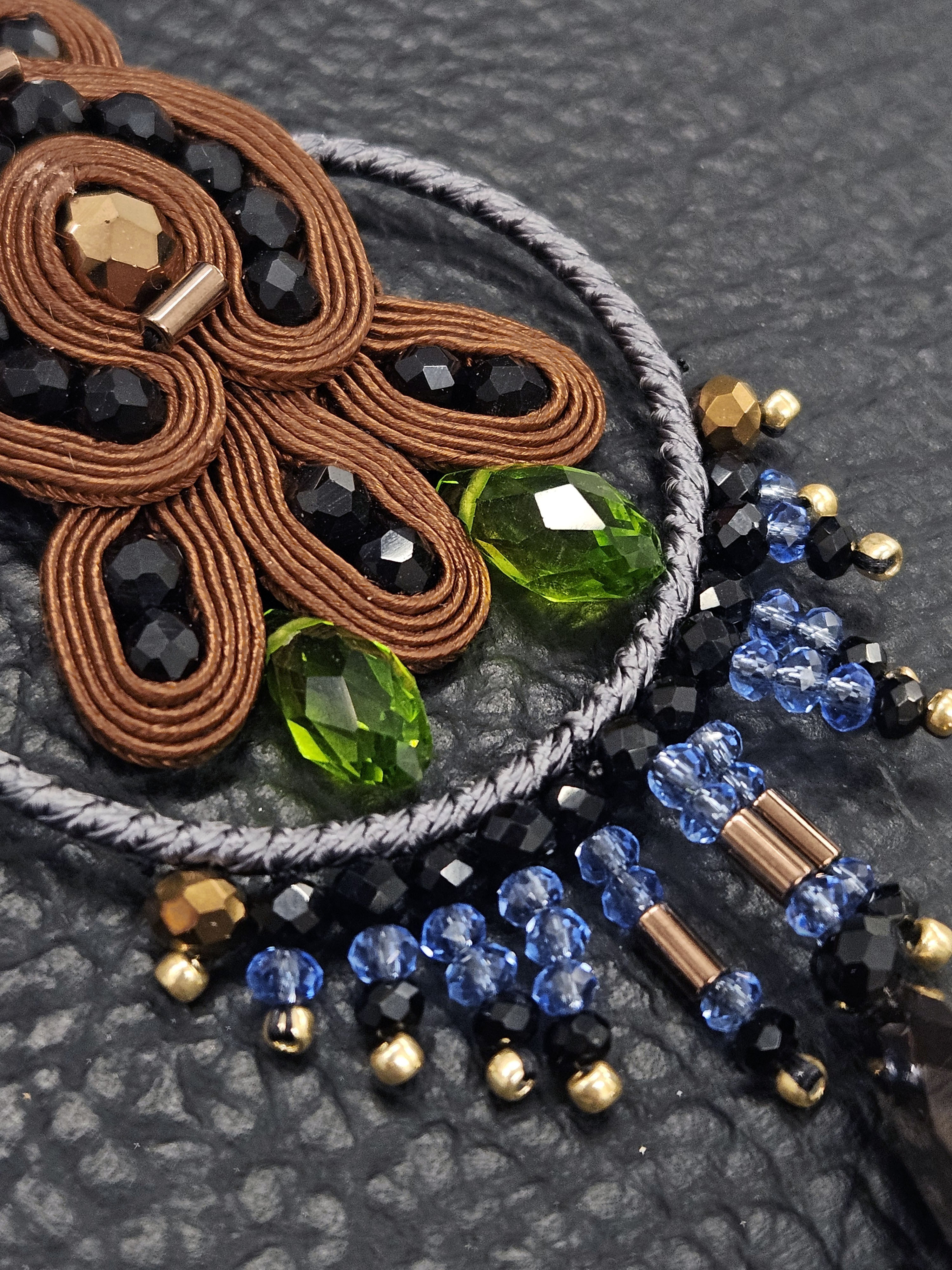 Estos pendientes únicos destacan por su espectacular combinación de colores y su diseño artesanal. Realizados mediante la técnica Soutache, están cosidos completamente a mano con hilo de rayón en tonos cobre, gris y negro. Incorporan cuentas de cristal facetado en distintos tamaños y colores, incluyendo un toque de verde oliva translúcido que aporta frescura y contraste al conjunto.